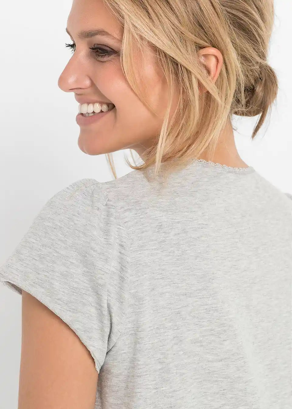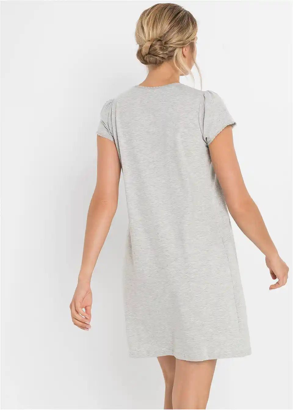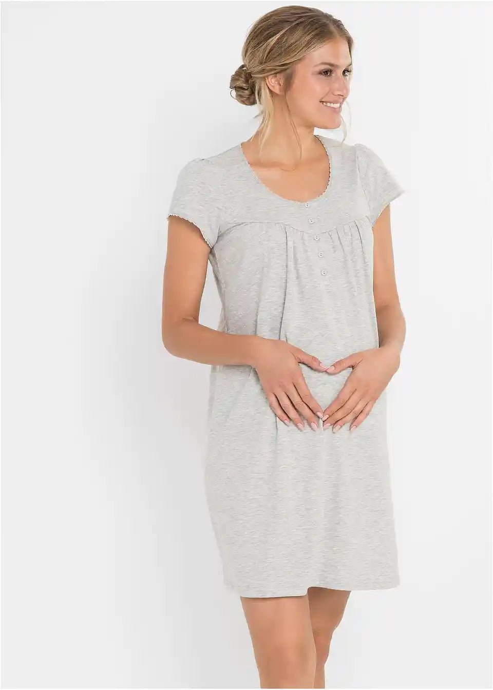 Nosečniška nočna srajca je praktično nočno perilo z nekaj dodatnega. Preprosti detajli, kot so naborki na sprednjem delu in ozki čipkasti trakovi na izrezu in rokavih, naredijo to lepo nočno nosečniško srajco pravi priljubljen kos. Mehka kakovost bombaža in kroj, ki objame postavo, zagotavljata visoko udobje pri nošenju. Zahvaljujoč majhni gumbnici je nočna srajca tudi zelo udobna za poznejše dojenje.
