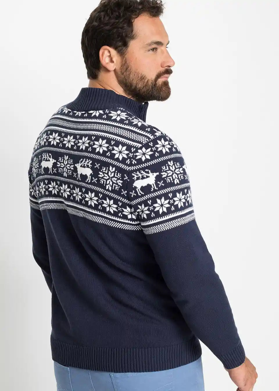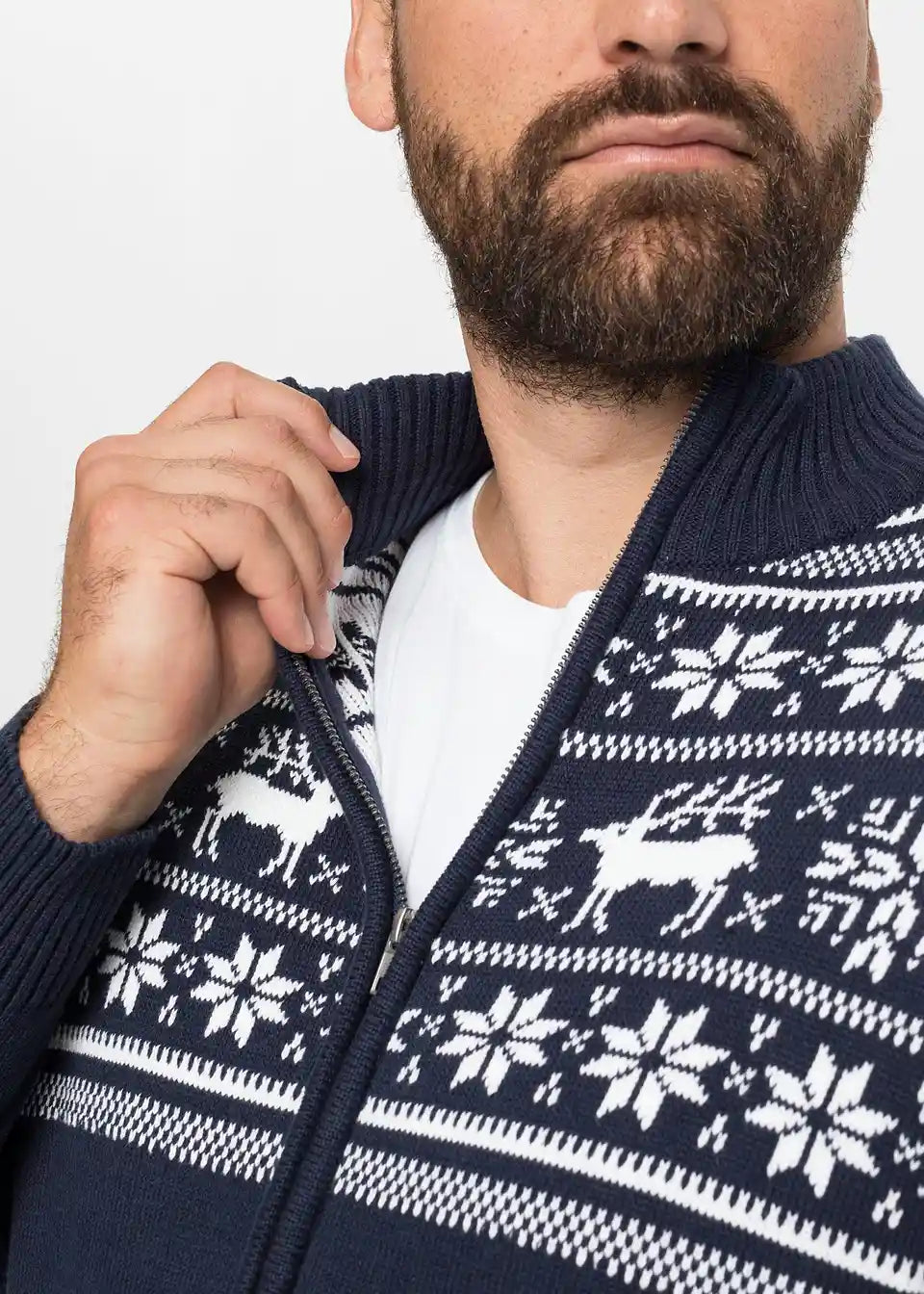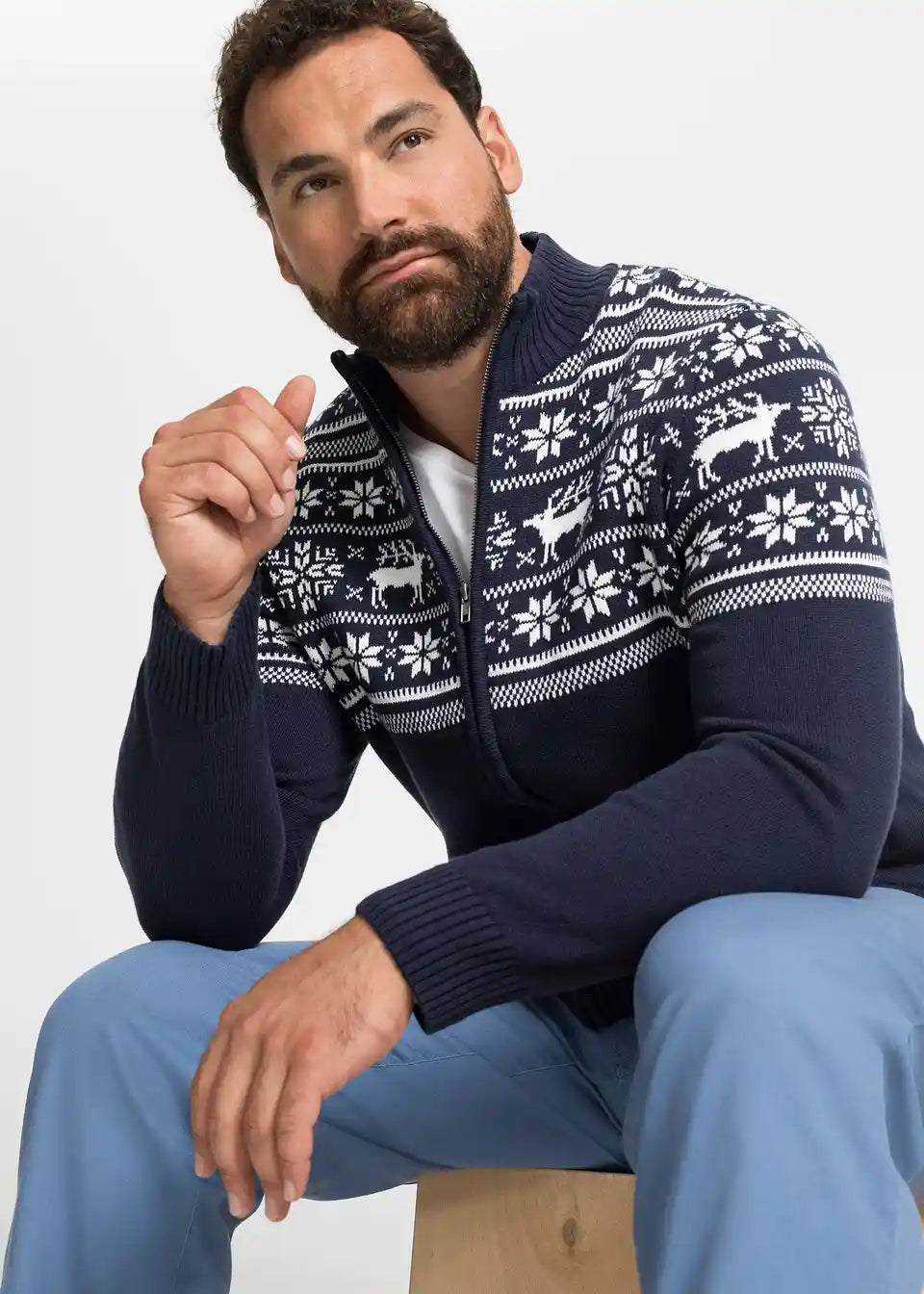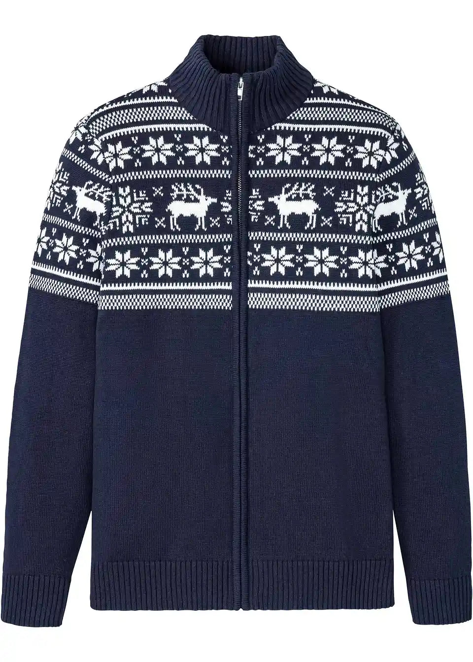 Modni norveški pleteni jopič z rebrastimi patentnimi robovi na rokavih in ob robu