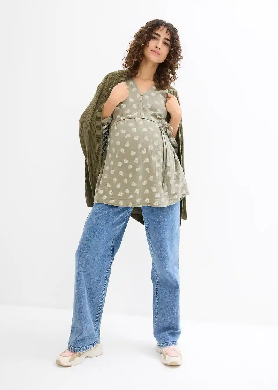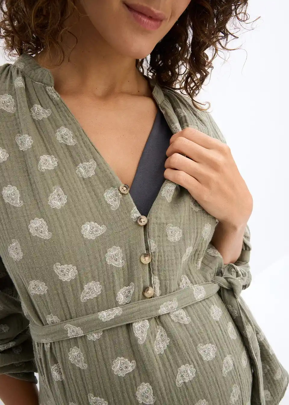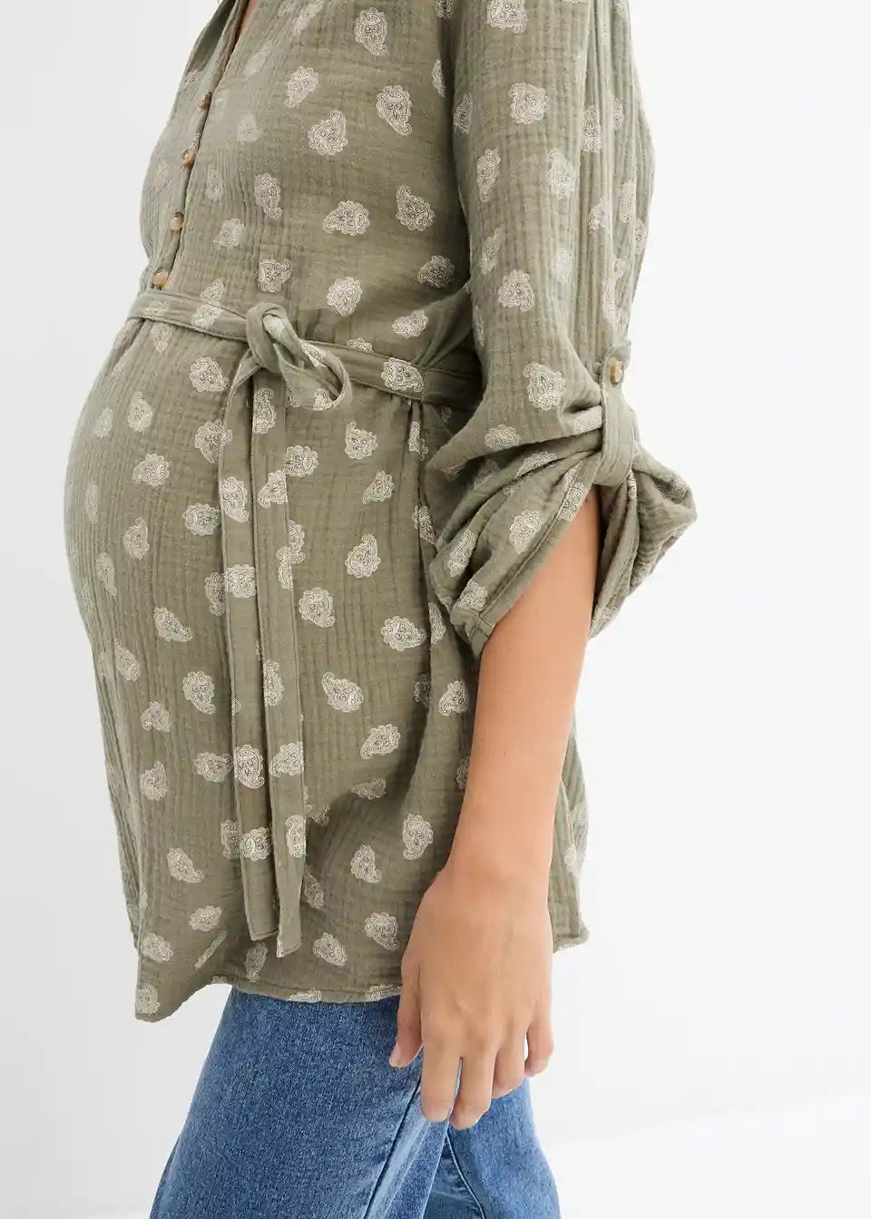 Zračna nosečniška bluza iz čistega bombažnega muslina s stilskim potiskom Paisley. V-izrez in majhen ovratnik dodata ženstven pridih, medtem ko snemljiv pas nežno poudari rastoči nosečniški trebuh. Po nosečnosti celotna vrsta gumbov omogoča enostavno dojenje. Rokave lahko individualno nastavite s paščki in gumbi. Mehki, zračni bombaž zagotavlja maksimalno udobje – vsestranski spremljevalec med nosečnostjo in časom dojenja.