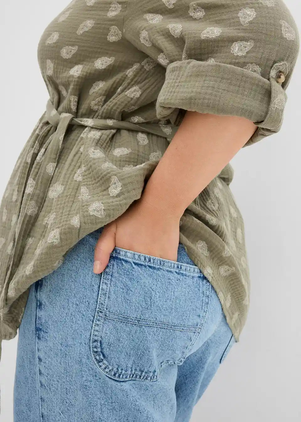 Zračna bluza za nosečnost iz čistega bombažnega muslina z elegantnim paisley potiskom. V-izrez in majhen ovratnik dodajata ženstven pridih, medtem ko odstranljiv pas nežno poudari rastoči nosečniški trebušček. Po nosečnosti omogoča celotna vrsta gumbov enostavno dojenje. Rokavi se lahko individualno prilagodijo s pomočjo traku in gumbov. Mehki, zračni bombaž zagotavlja maksimalno udobje – vsestranski spremljevalec za obdobje nosečnosti in dojenja.