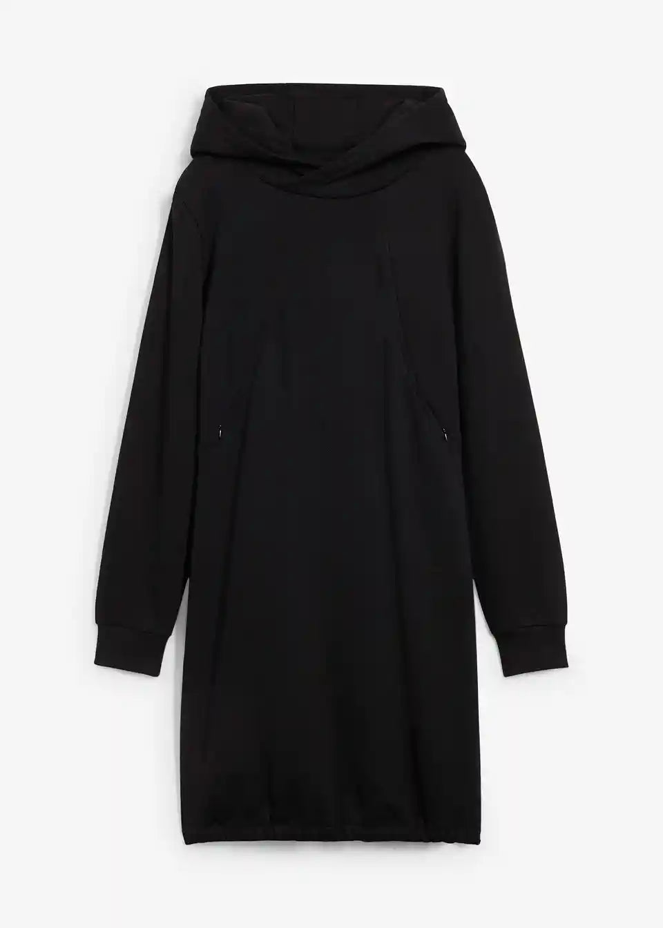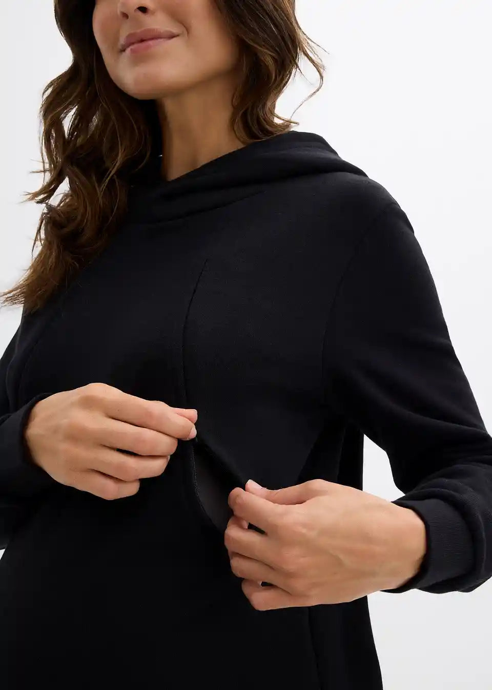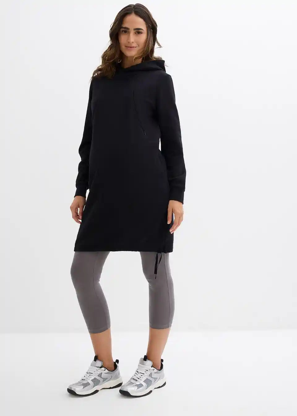 Mehka obleka za dojenje iz prijetno toplega bombaža z kapuco in žepi. Diskretne zadrge v zgornjem delu omogočajo enostavno in udobno dojenje. Elastični rob na spodnjem delu uravnava širino in dolžino. Mehke rebraste manšete na zaključku rokavov zaokrožujejo dizajn.