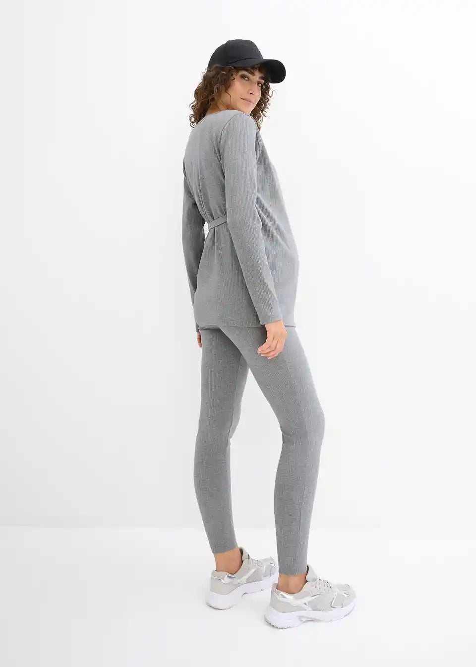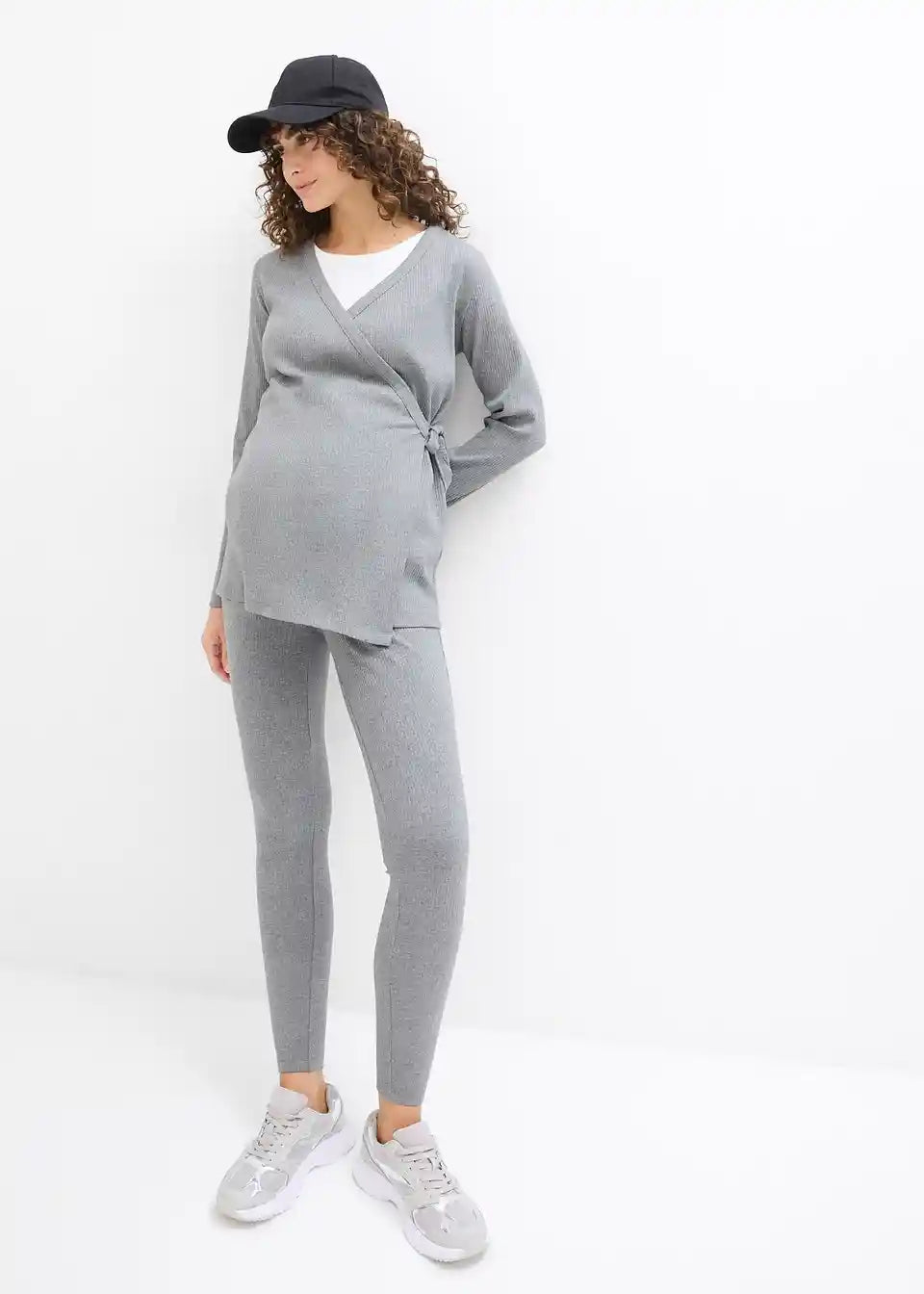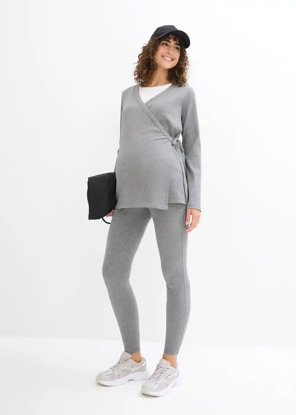 Udoben komplet z dolgimi rokavi in hlačami, ki lepo poudarijo postavo, iz mehkega jerseya zagotavlja udobje in prilagodljivost v vsakdanjem življenju. Zgornji del s preklopnim krojem se prilagodi obsegu trebuha in omogoča enostavno dojenje po nosečnosti.
