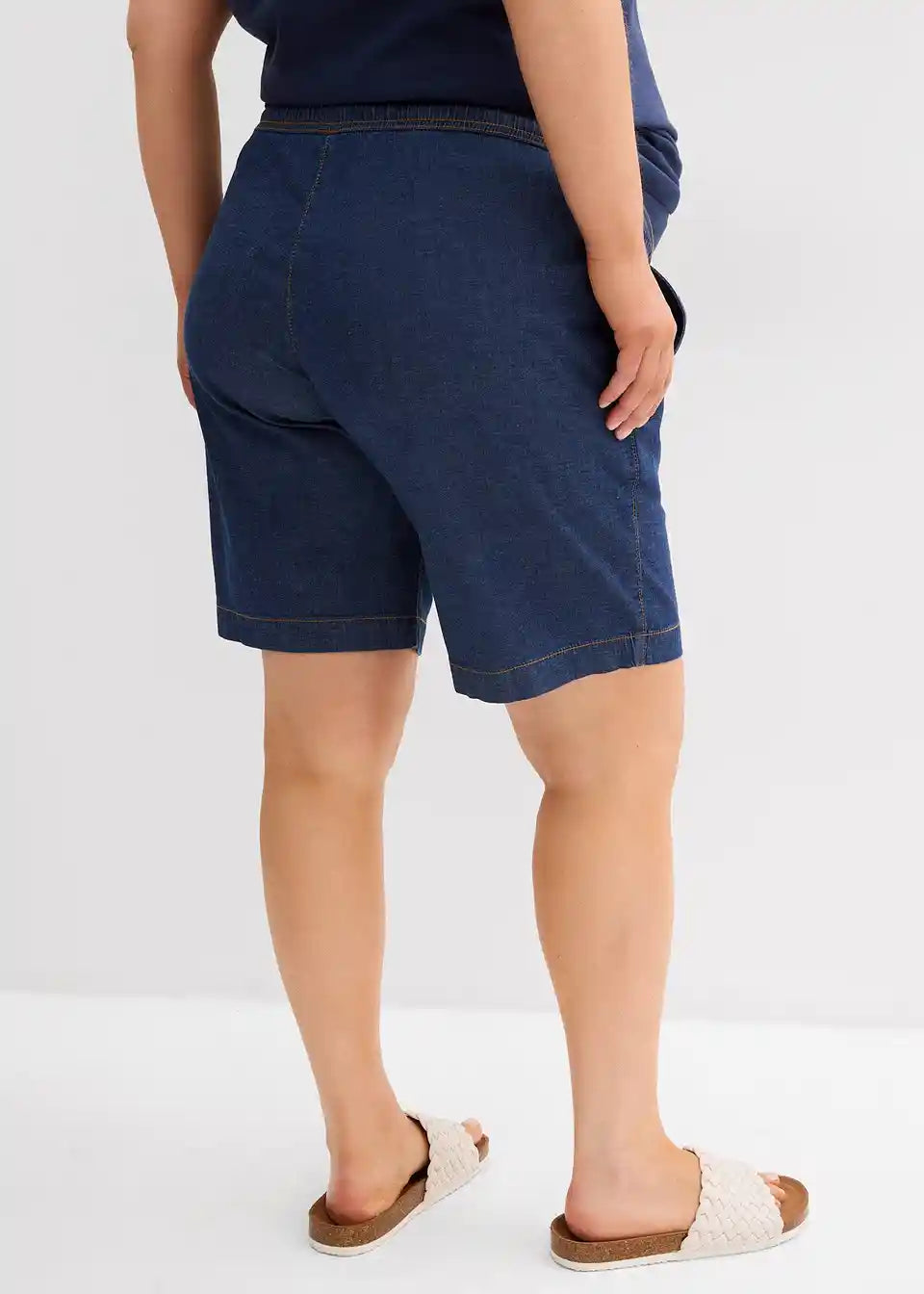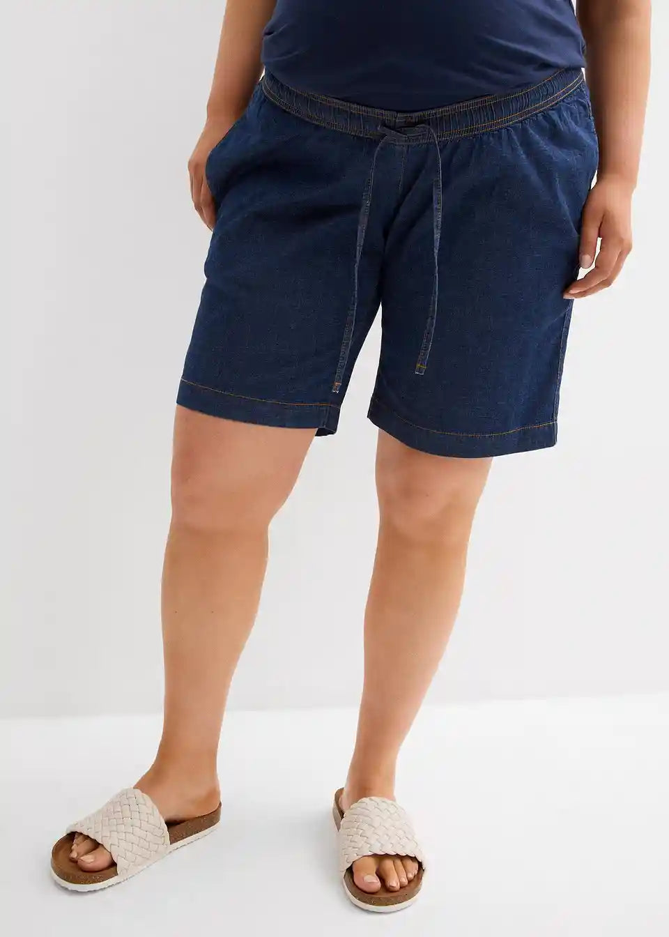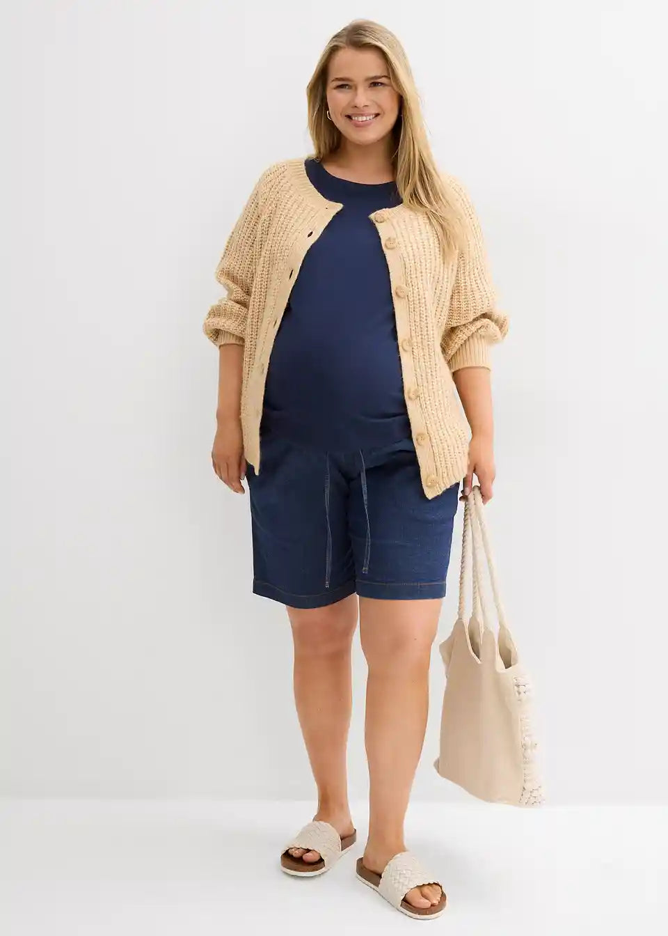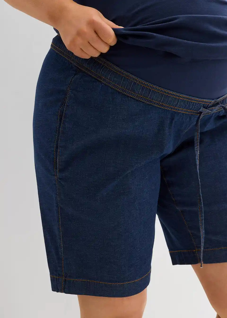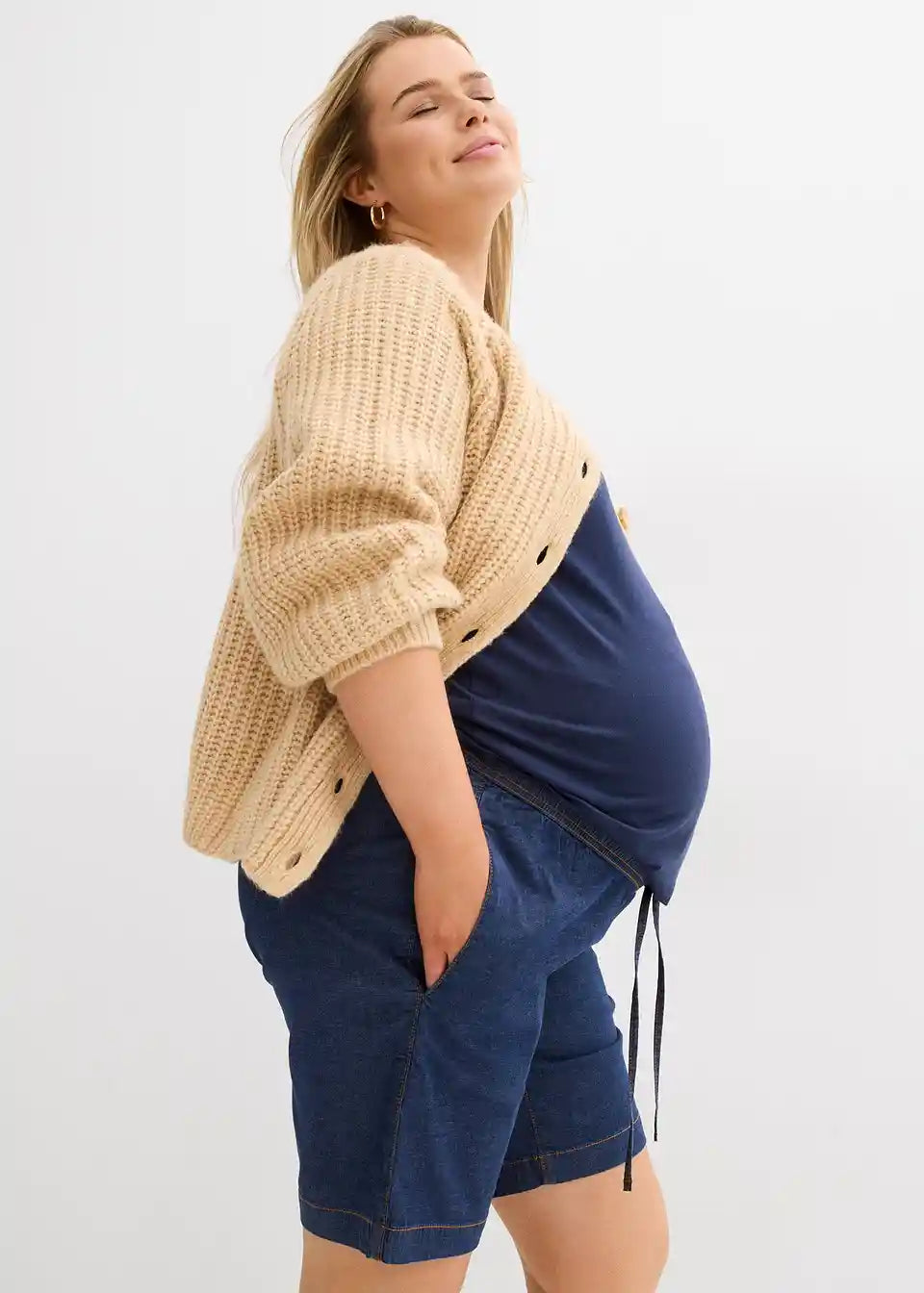 Kratke nosečniške hlače iz lahkega raztegljivega jeansa za udobno nošenje. Širok, všit rebrast pas iz bombaža z elastanom zagotavlja optimalno prileganje okoli trebuha. Elastični pas se nežno prilagodi rastočemu trebuhu, ne da bi tiščal ali omejeval, ter poskrbi za prijetno prileganje. Všite zavezovalne vrvice omogočajo dodatno prilagajanje širine. S praktičnimi stranskimi žepi. Sproščen kroj in lahko blago sta idealna za poletje.