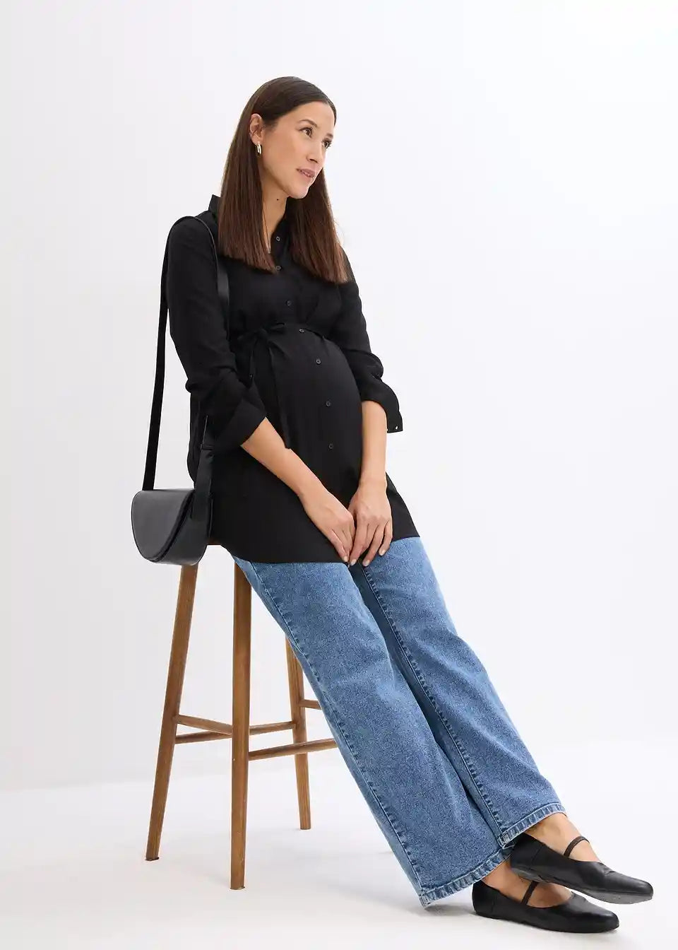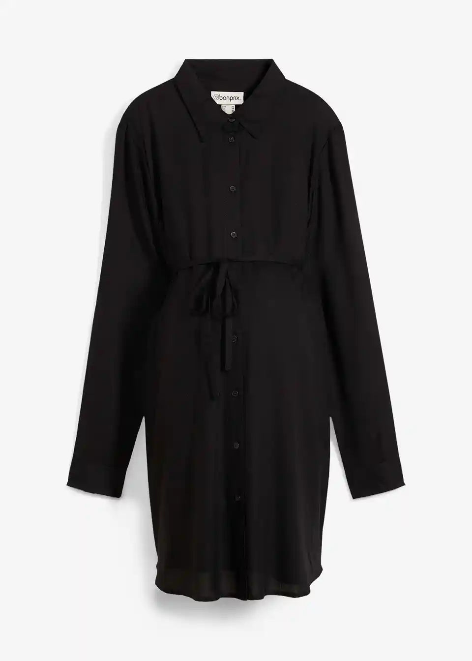 Bluza z dolgimi rokavi iz viskoze, s celovito zapenjanjem na gumbe in ozkim, odstranljivim pasom za vezanje pod prsmi. Rahlo zaobljen spodnji rob.
