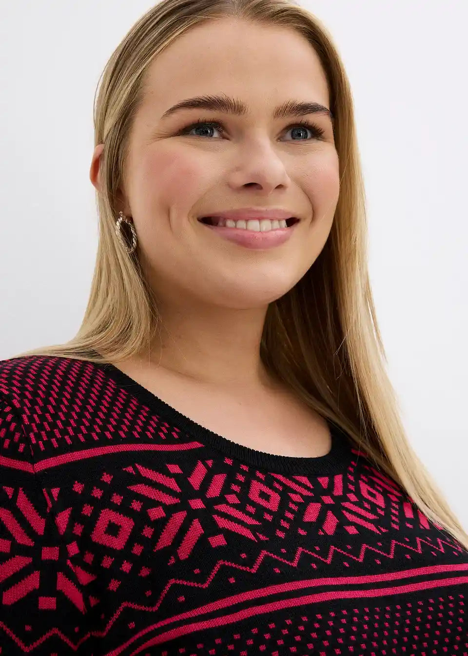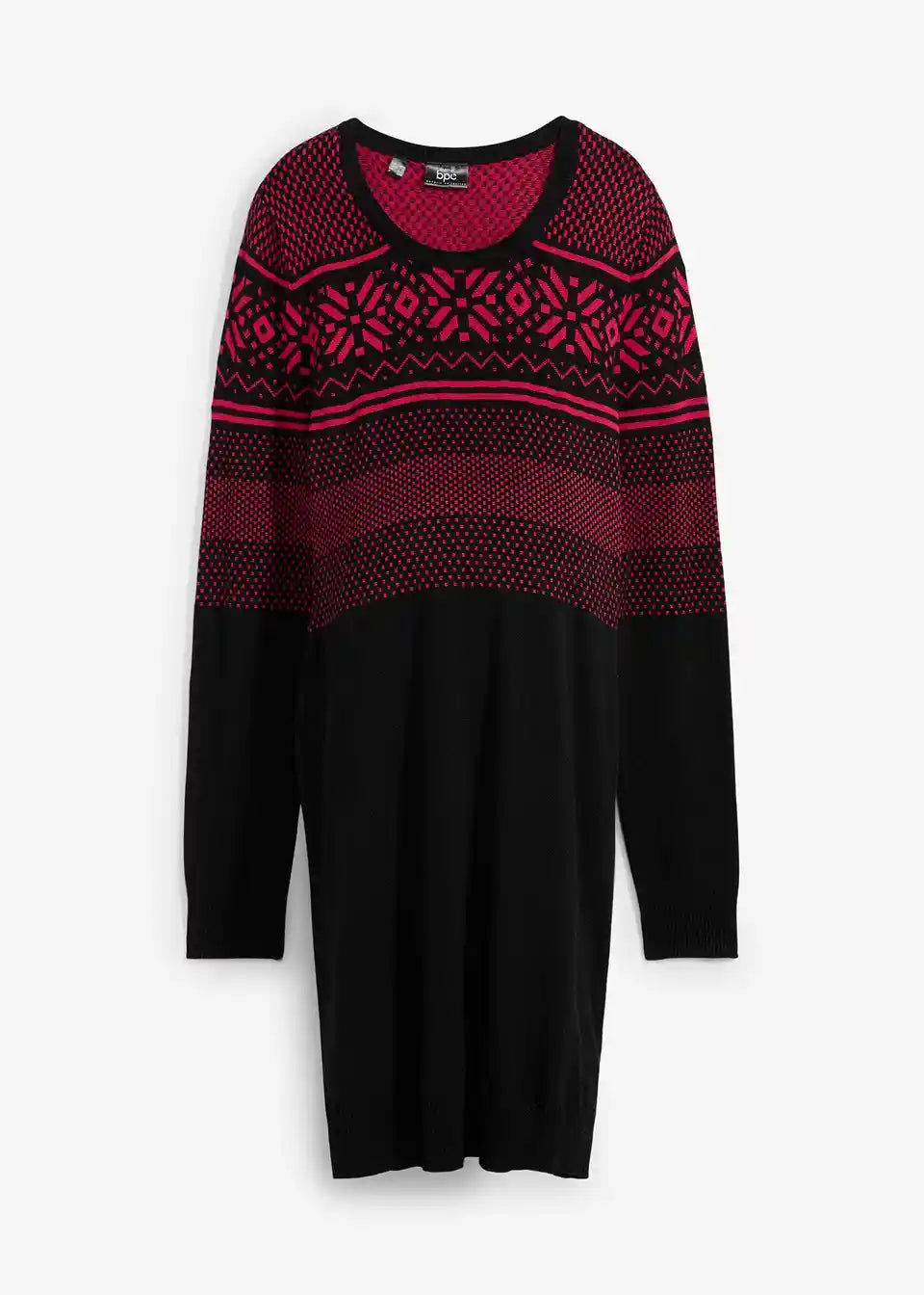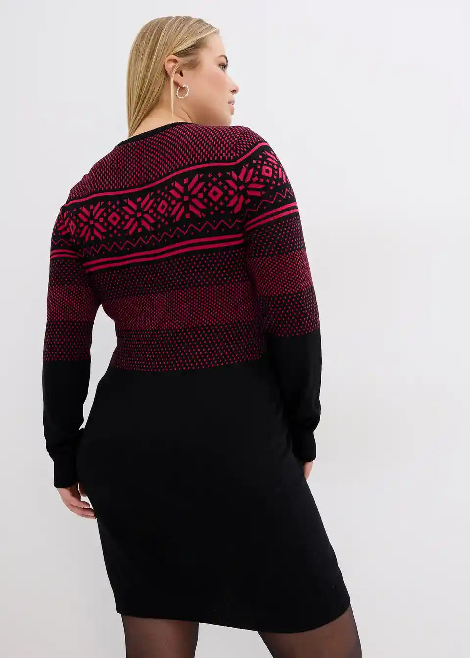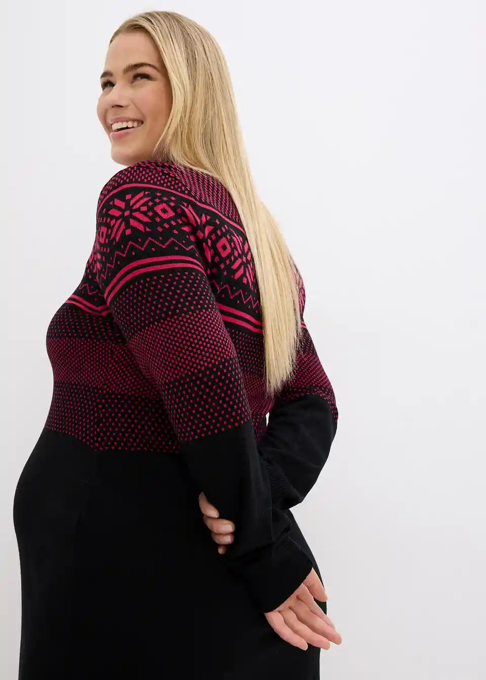 Nosečniška pletena obleka z norveškim vzorcem. Zahvaljujoč naborkom na trebuhu in dovolj prostora za trebuh je ta nosečniška obleka primerna za vse mesece nosečnosti. Z rebrastimi robovi.