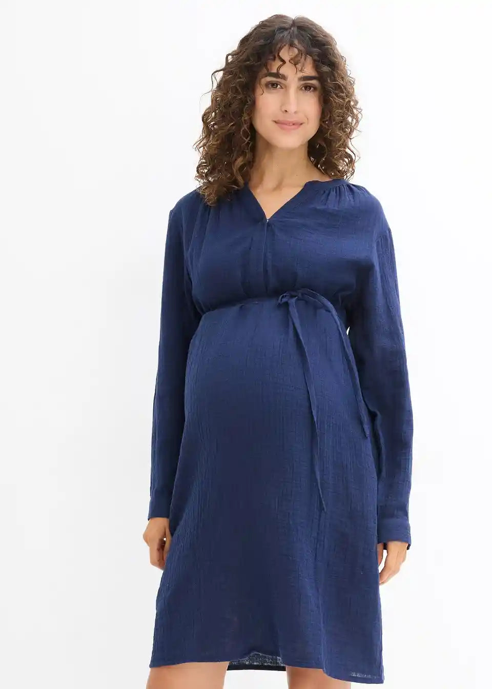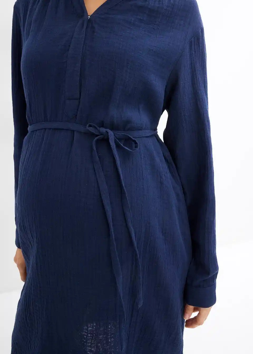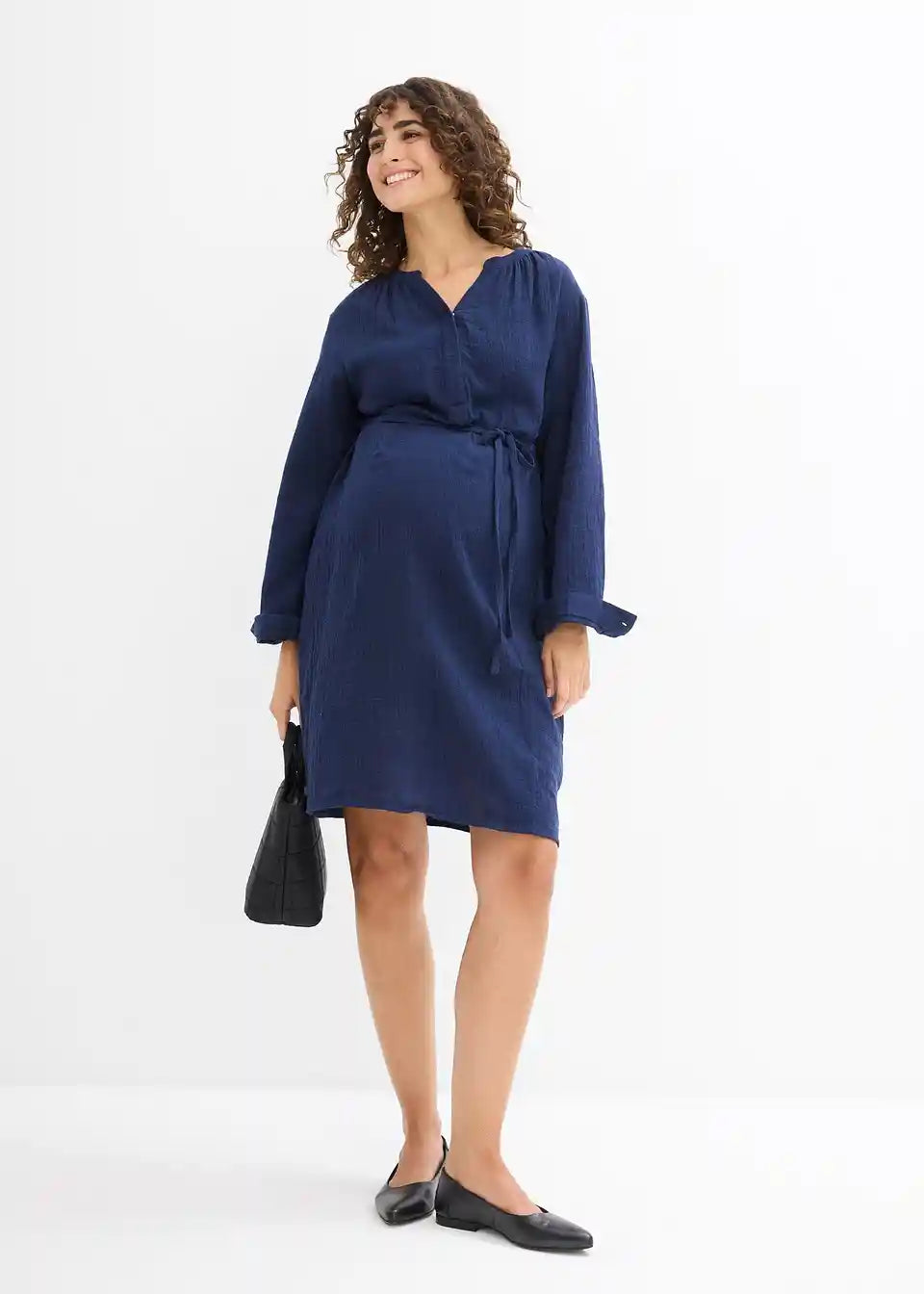 Nosečniška obleka s funkcijo dojenja iz čistega bombažnega muslina zagotavlja maksimalno udobje tako med nosečnostjo kot v obdobju dojenja. Obleka ima majhen stoječ ovratnik in dolge gumbe s skritimi pritiskači, kar omogoča enostavno dojenje ter priročno oblačenje in slačenje. Snemljiv pas poudari rastoči nosečniški trebušček. Dolgi rokavi so opremljeni z manšetami in gumbi. Mehak, zračen bombažni material zagotavlja prijeten občutek pri nošenju.