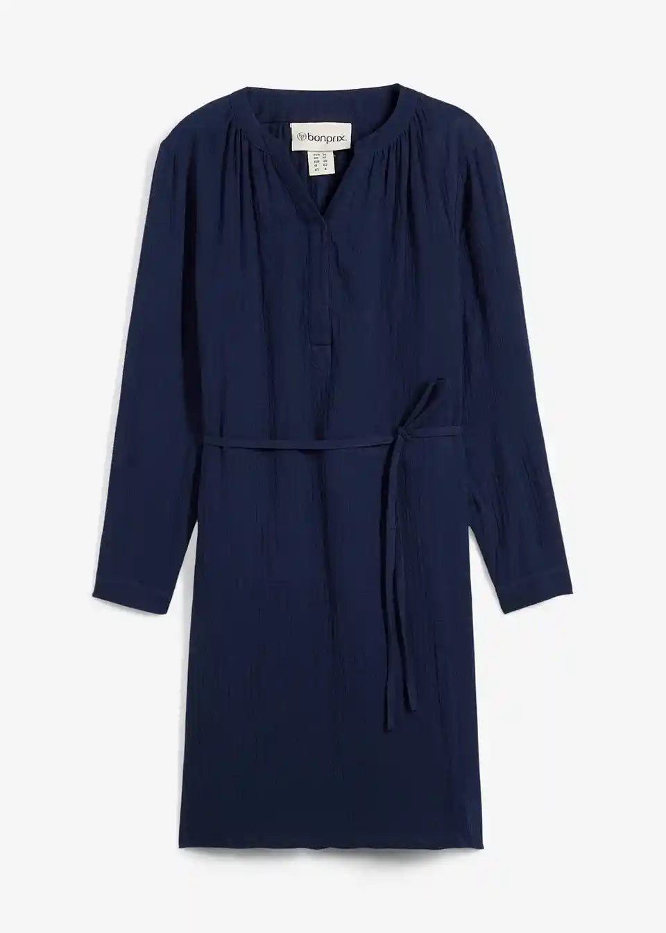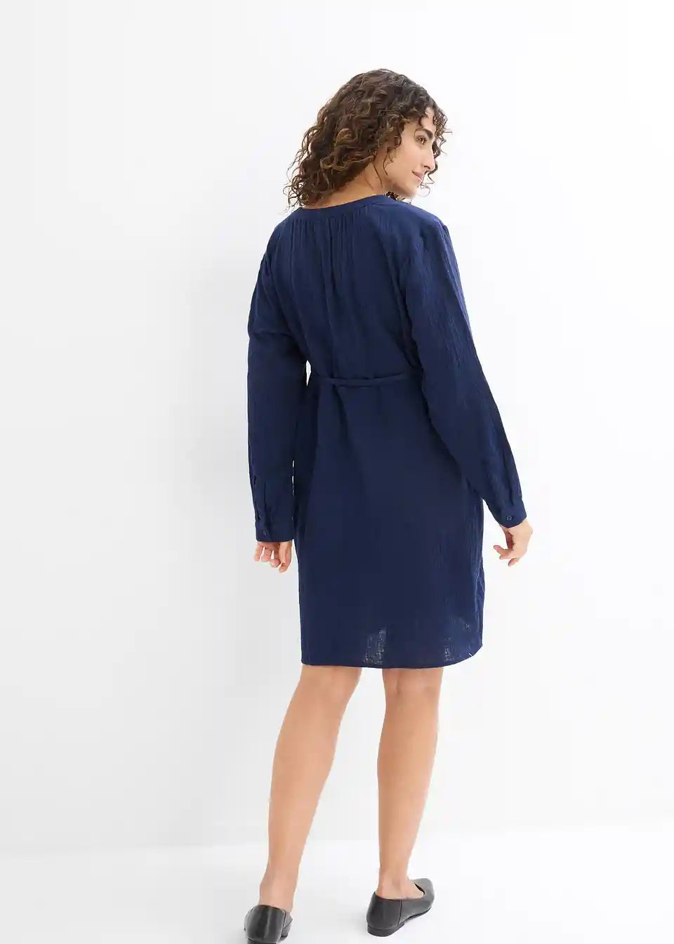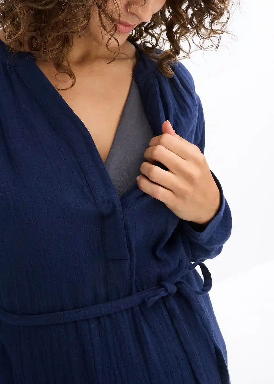 Nosečniška obleka s funkcijo dojenja iz čistega bombažnega muslina zagotavlja maksimalno udobje tako med nosečnostjo kot v obdobju dojenja. Obleka ima majhen stoječ ovratnik in dolge gumbe s skritimi pritiskači, kar omogoča enostavno dojenje ter priročno oblačenje in slačenje. Snemljiv pas poudari rastoči nosečniški trebušček. Dolgi rokavi so opremljeni z manšetami in gumbi. Mehak, zračen bombažni material zagotavlja prijeten občutek pri nošenju.