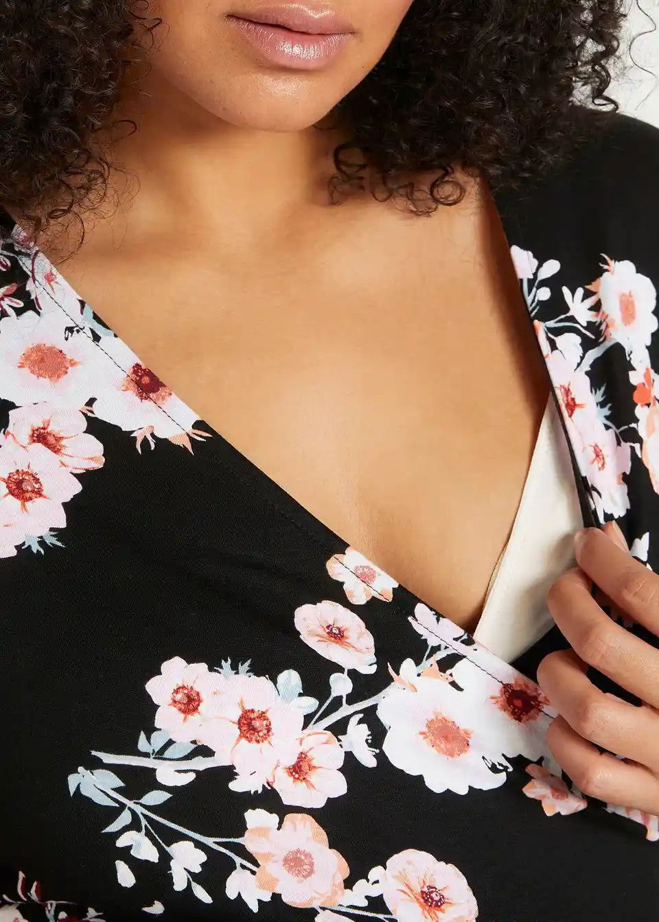 Ta tunika za dojenje z videzom ovijanja je praktičen spremljevalec vsake matere. Zaradi preprostega, a funkcionalnega kroja in cvetličnega dizajna je ta majica absolutna nujnost. Pred porodom se zaradi ohlapnega kroja prilagaja rastočemu nosečniškemu trebuščku.