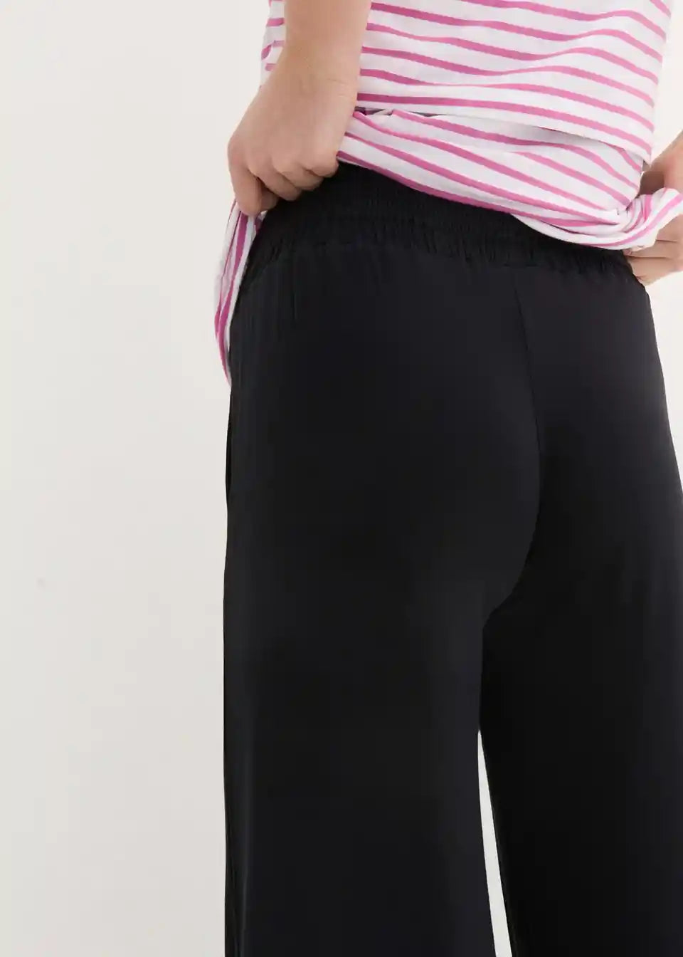 Mehke hlače iz jerseya iz mehke viskoze z rahlim raztegom za visoko udobje pri nošenju, z dodanim smock-pasom, ki se nežno prilagaja posameznemu mesecu nosečnosti. S praktičnimi stranskimi žepi spredaj. Udoben kroj s širokimi, gležnjem prostimi hlačnicami.