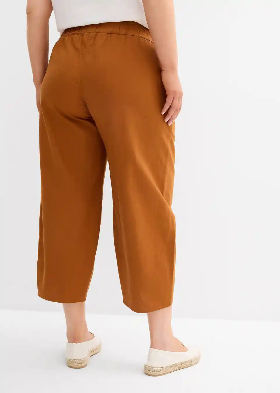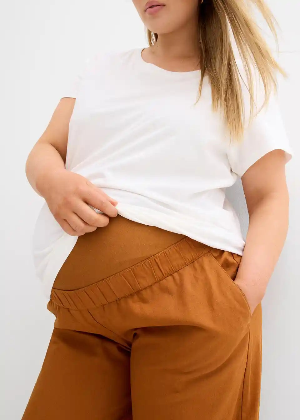 Udobne nosečniške hlače s praktičnimi žepi, 7/8 dolžine, iz zračne mešanice lanu in bombaža. Material poskrbi za prijetno hlajenje v toplih dneh, medtem ko ohlapen kroj omogoča veliko svobode gibanja. Širok všit pas iz jerseya iz bombaža z dodatkom razteznosti zagotavlja optimalno prileganje na predelu trebuha.