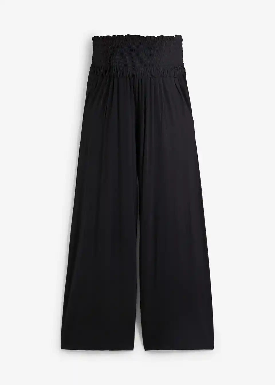 Mehke jersey hlače iz mehke viskoze z nekaj elastana za visoko udobje nošenja, z dodanim smock pasom, ki se nežno prilagaja posameznemu mesecu nosečnosti. S praktičnimi všitimi žepi na sprednji strani. Udoben kroj s širokimi, gležnje prostimi hlačnicami.