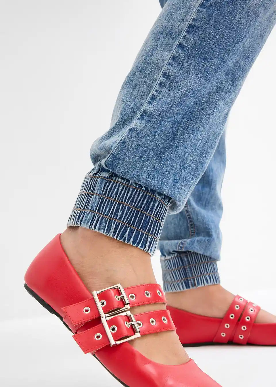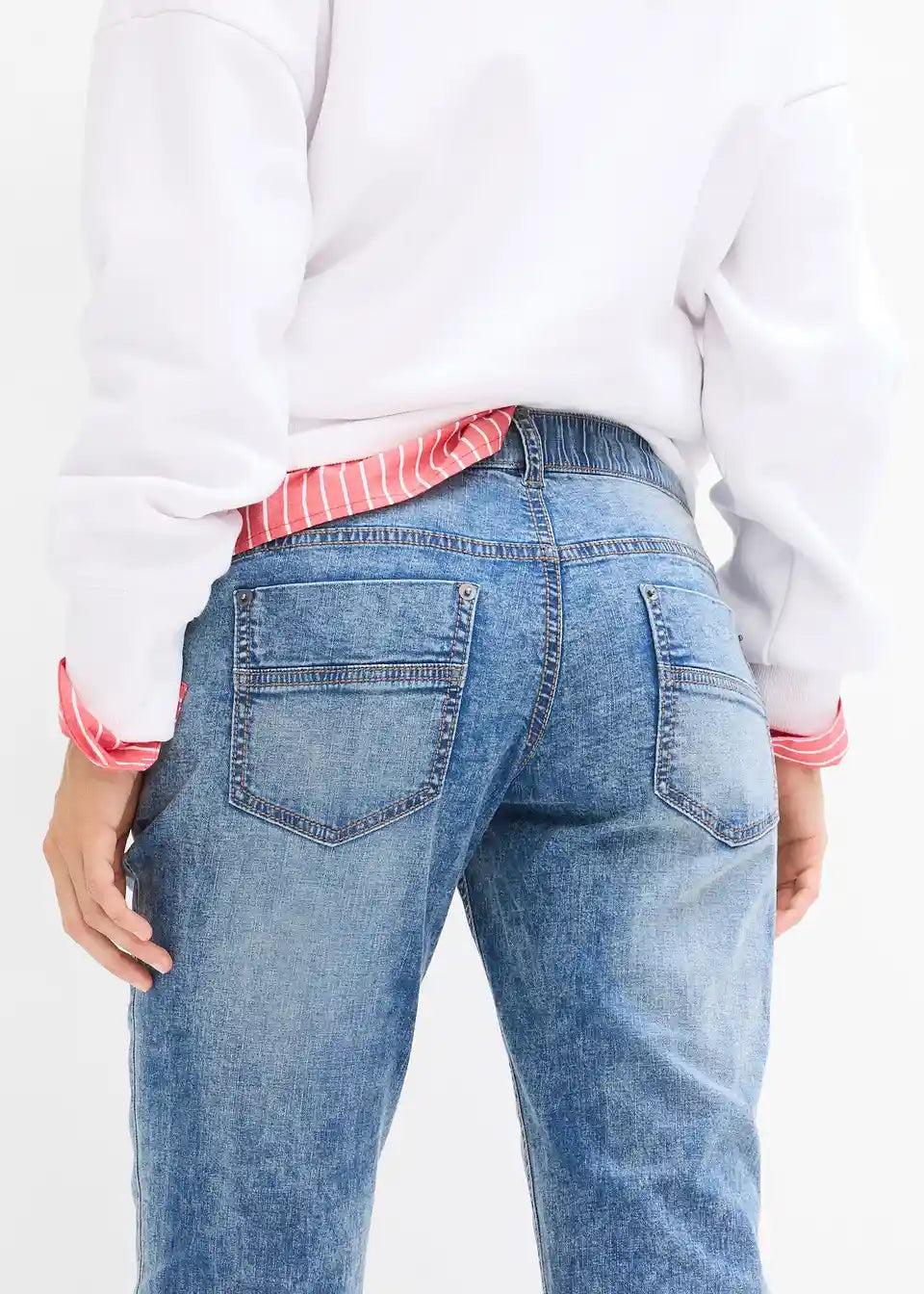 5-žepne kavbojke iz organskega bombažnega denima s primesjo elastana za visoko udobje. Udoben kroj s širšimi stegenskimi deli in zoženimi hlačnicami z mehkim patentom na robu. Širok, prišit jersey pas zagotavlja optimalno prileganje na trebuhu. Za dodatno udobje je pas brez gumbov opremljen z elastično gumo in nastavljivimi vezalkami.