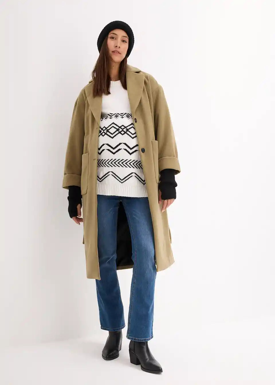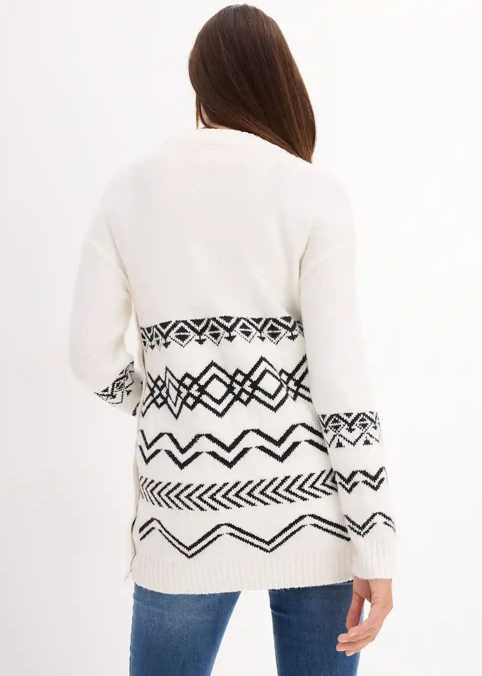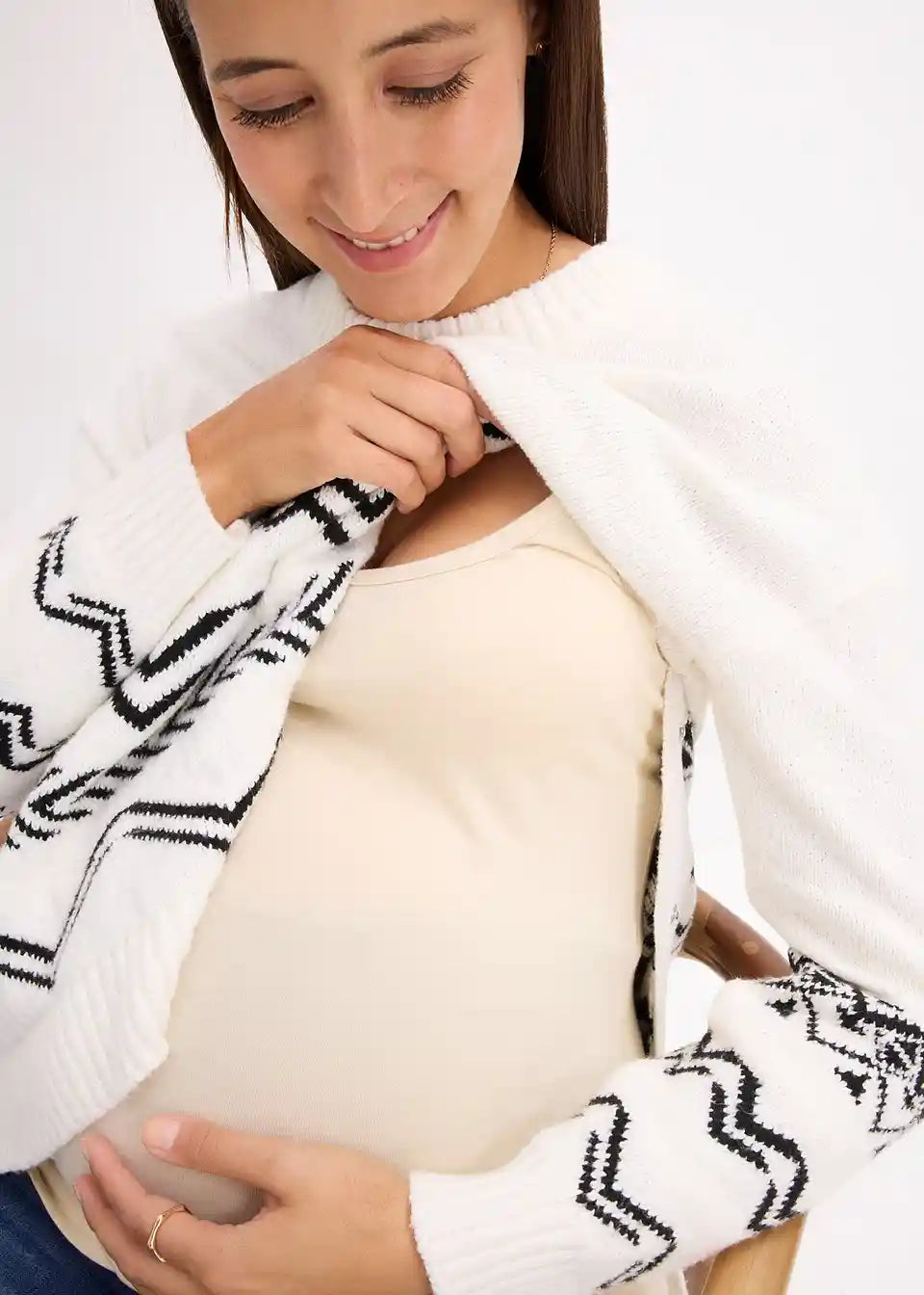 Mehak nosečniški pulover iz mešanice bombaža z norveškim vzorcem. Okrasni pritiskači na obeh stranskih šivih omogočajo praktično in diskretno funkcijo dojenja ter se lahko uporabijo za razširitev puloverja.