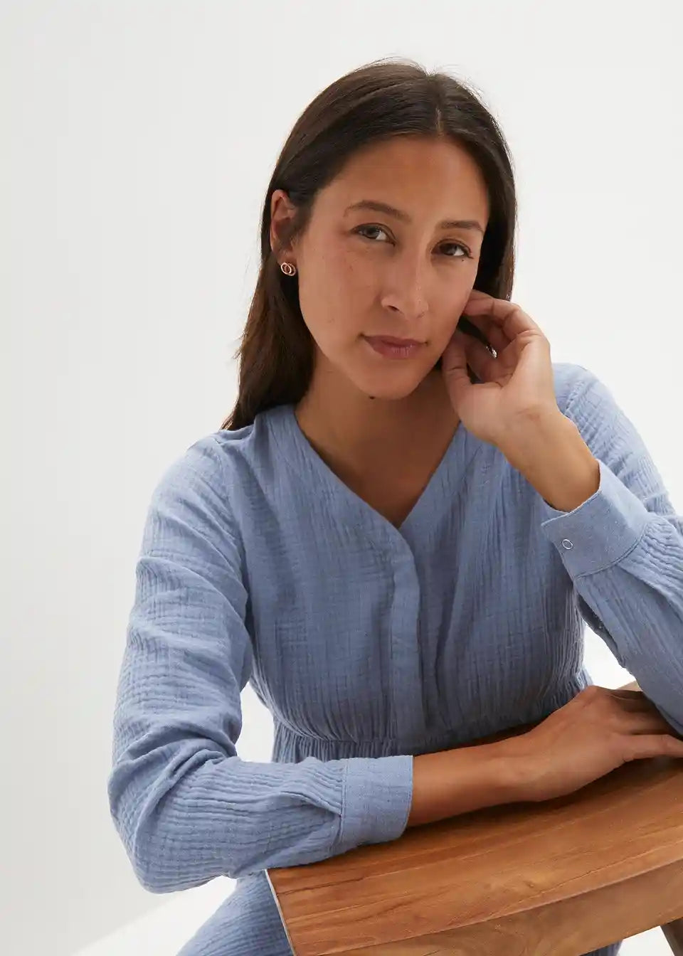 Obleka z dolgimi rokavi in kratko, skrito zapiranje z gumbi, ki omogoča enostavno dojenje. Z mehkimi elastičnimi gumicami nad pasom in rahlo razširjenim krilom. Rokavi so opremljeni z manšetami in gumbi.