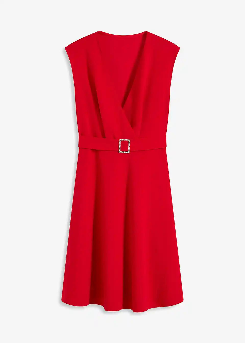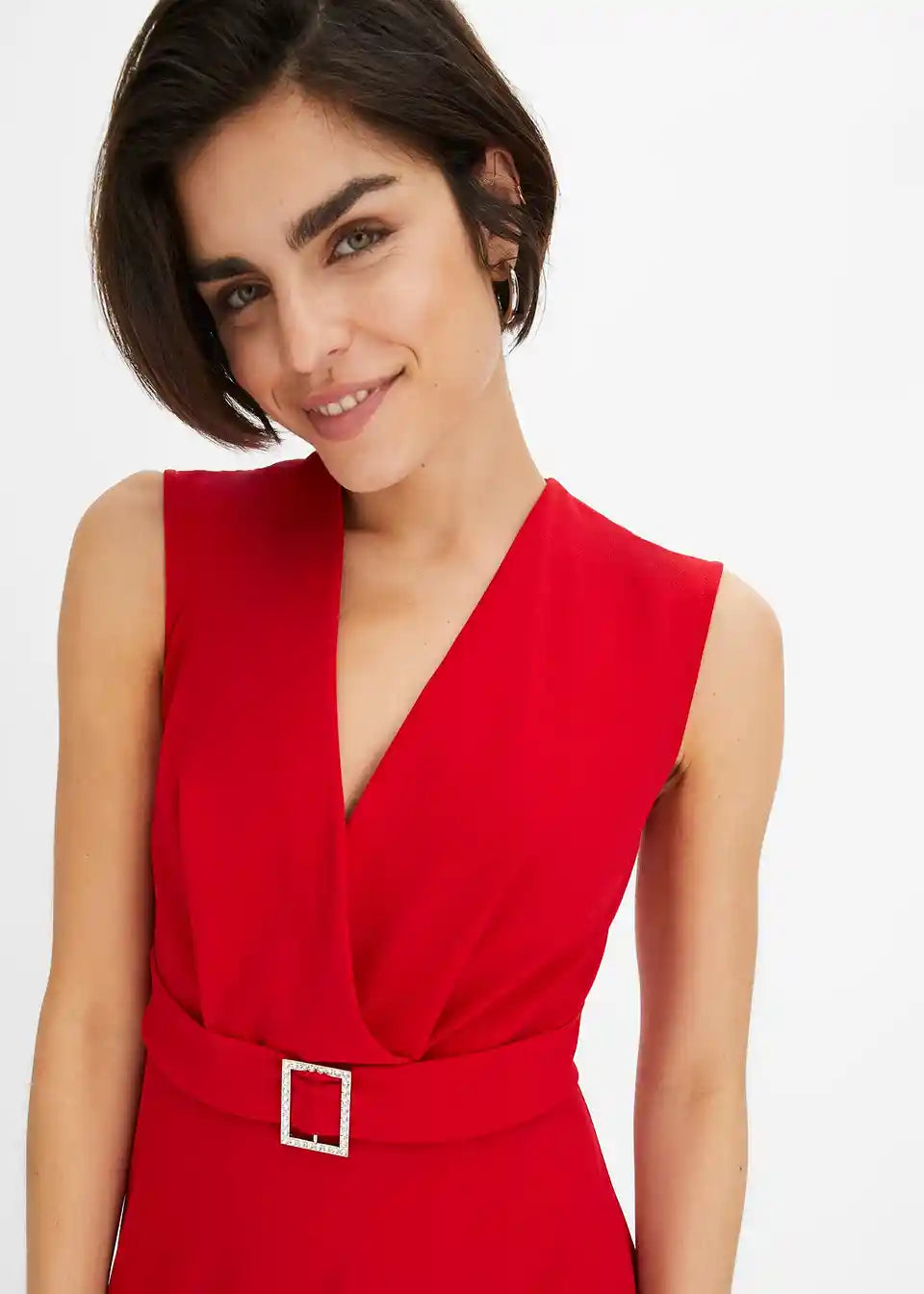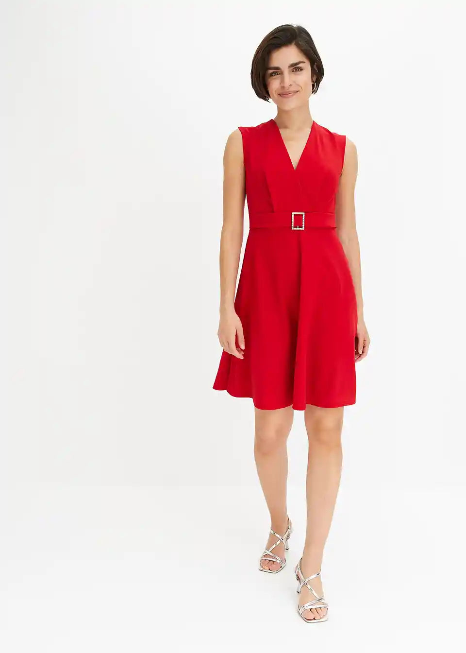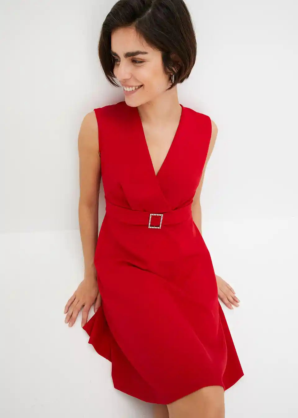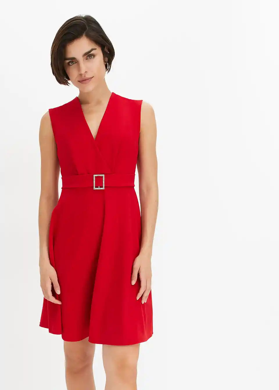 ženska obleka s dekorativno zaponko spredaj v pasu