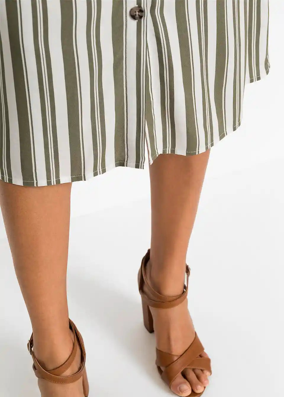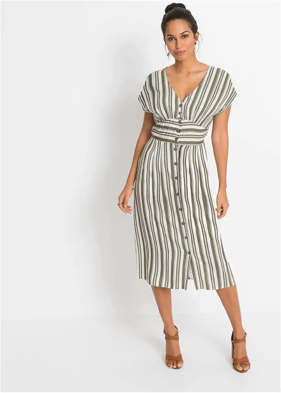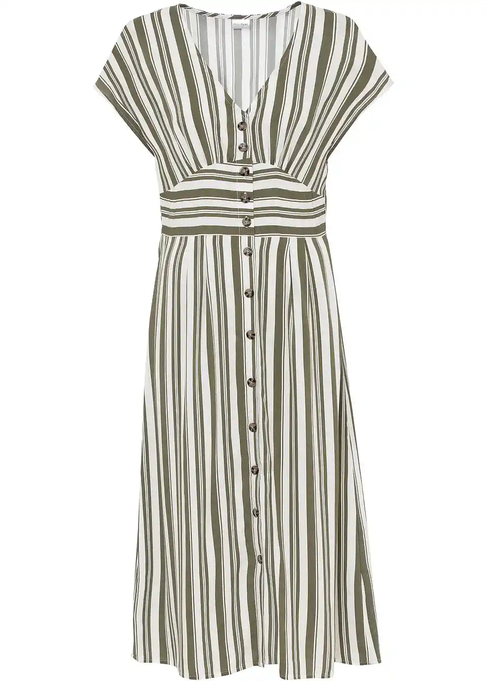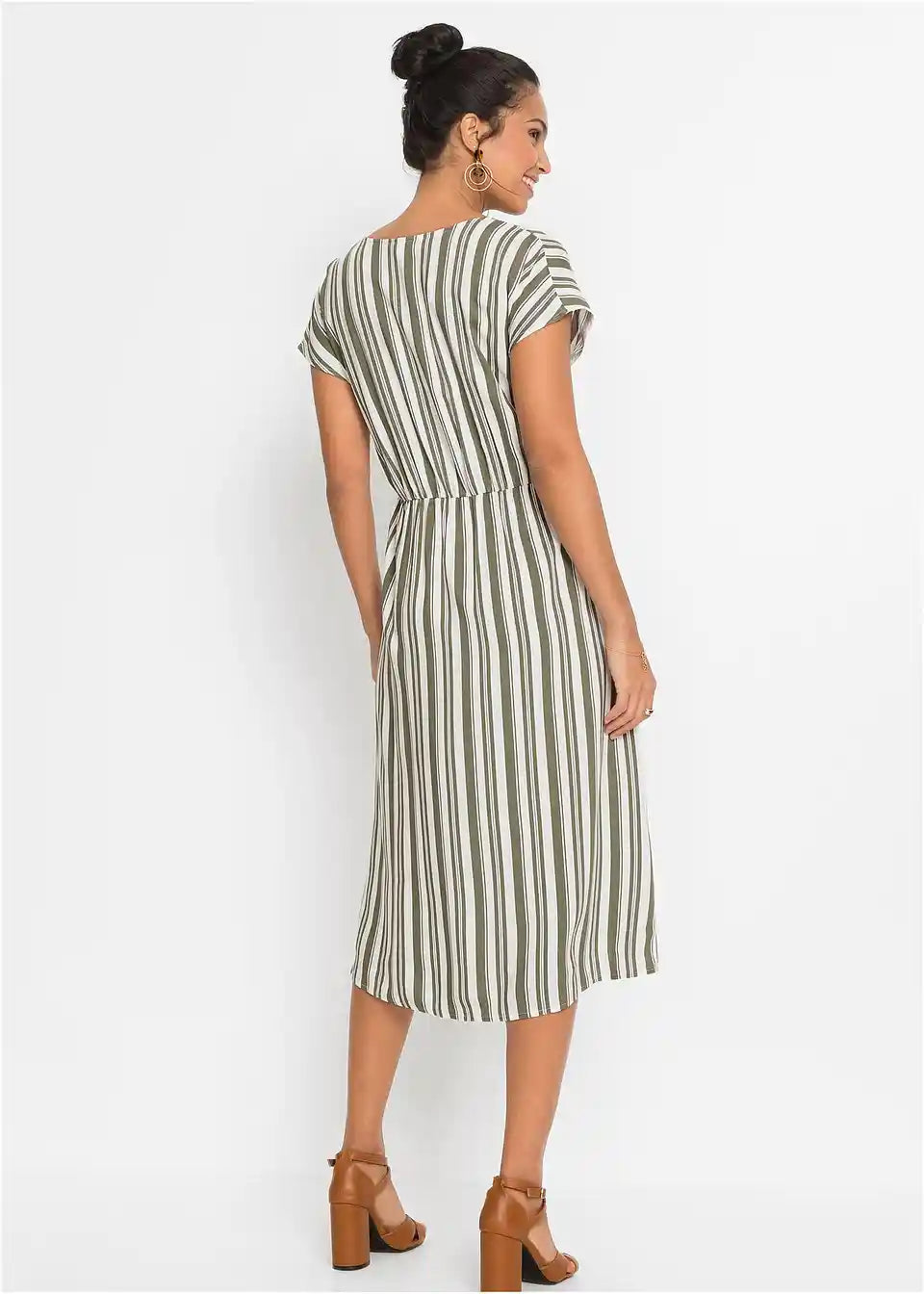 Poletna obleka je natisnjena s čudovitim črtastim vzorcem in ima prečno zaporedne gumbnice. Poleg tega ima naborke na predelu prsi in pasu. Dolžina v št. 42 znaša približno 114 cm.