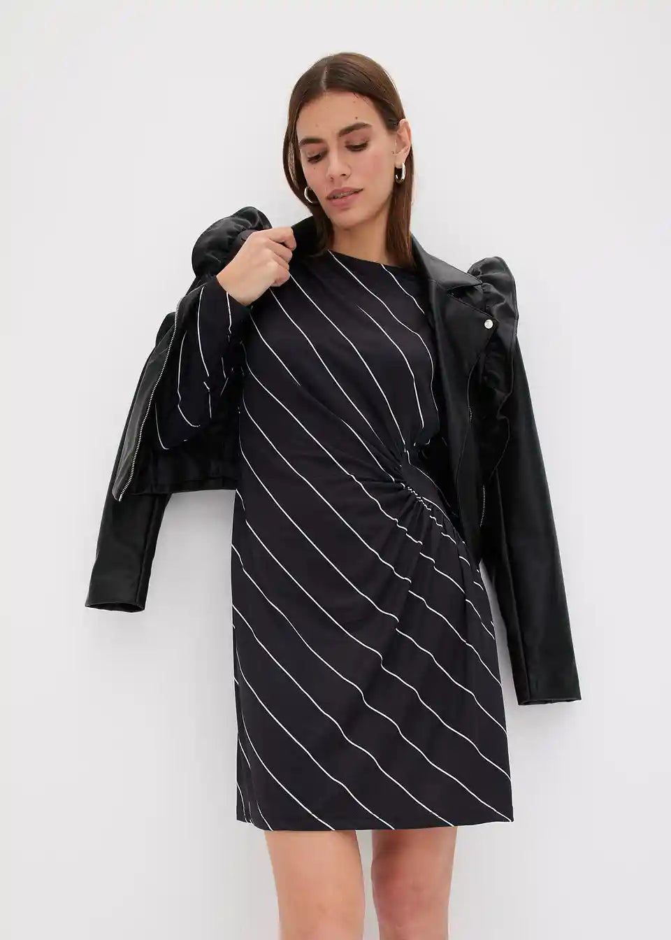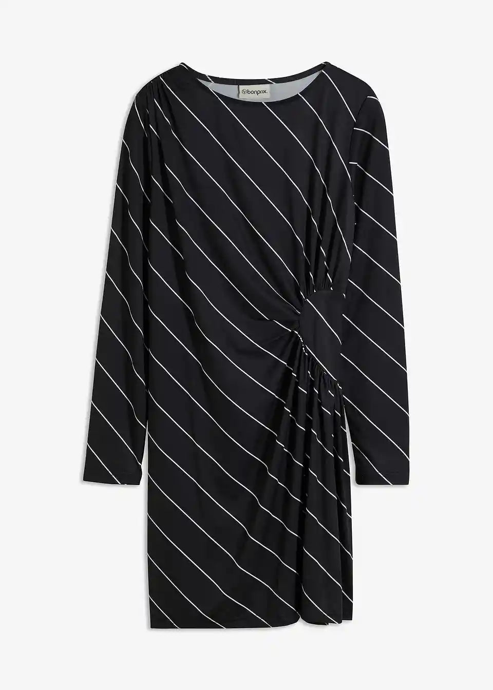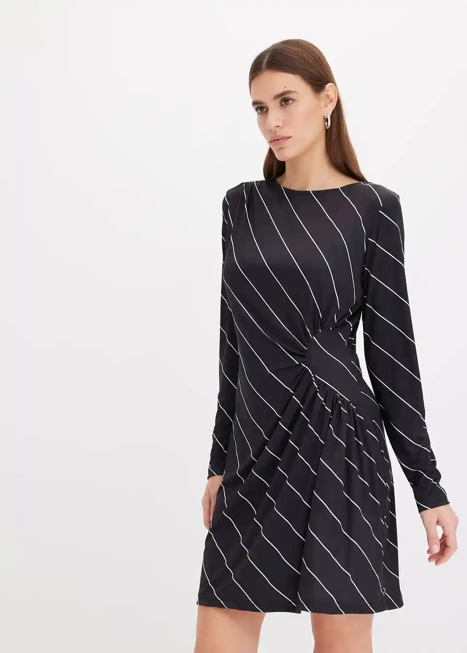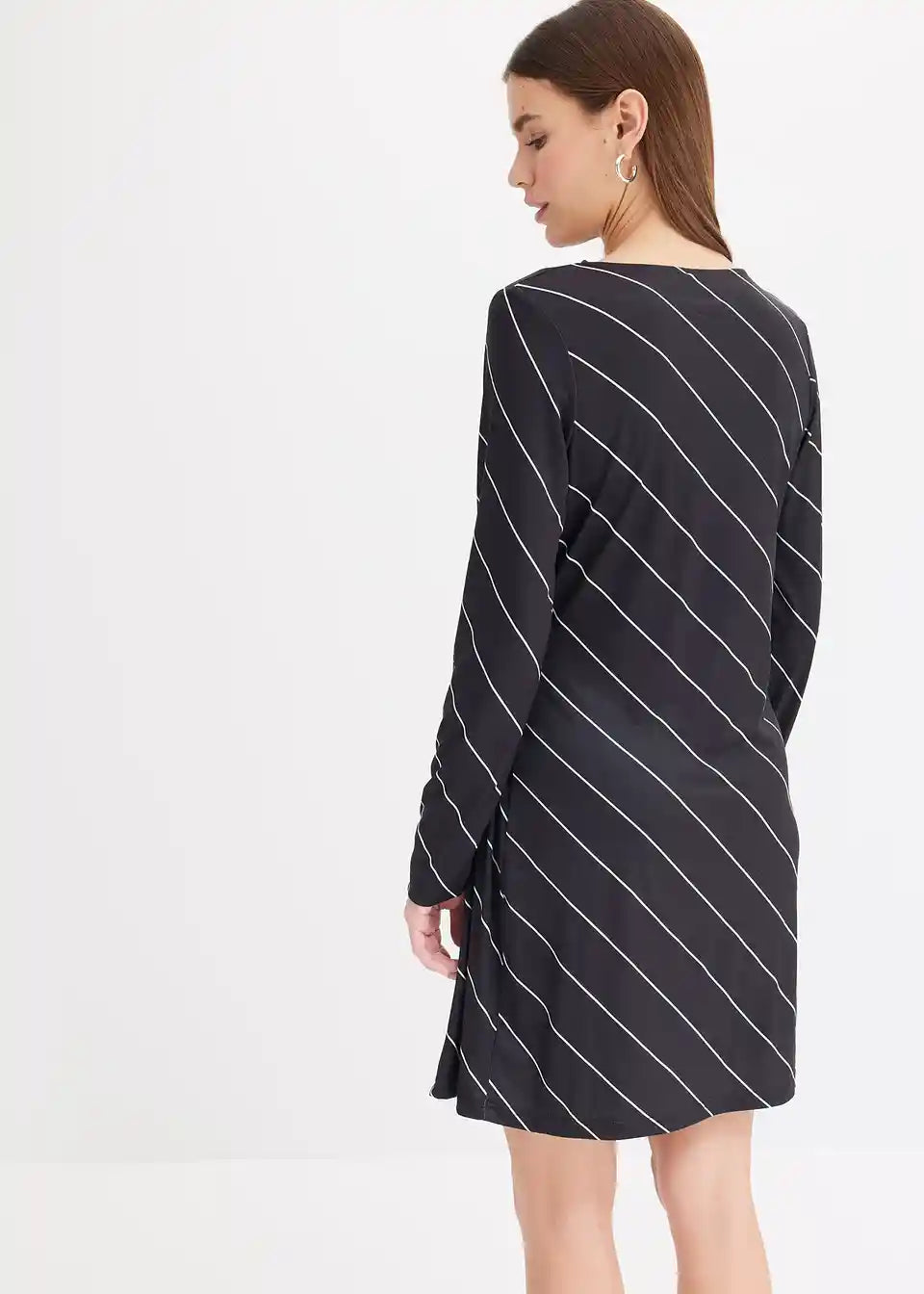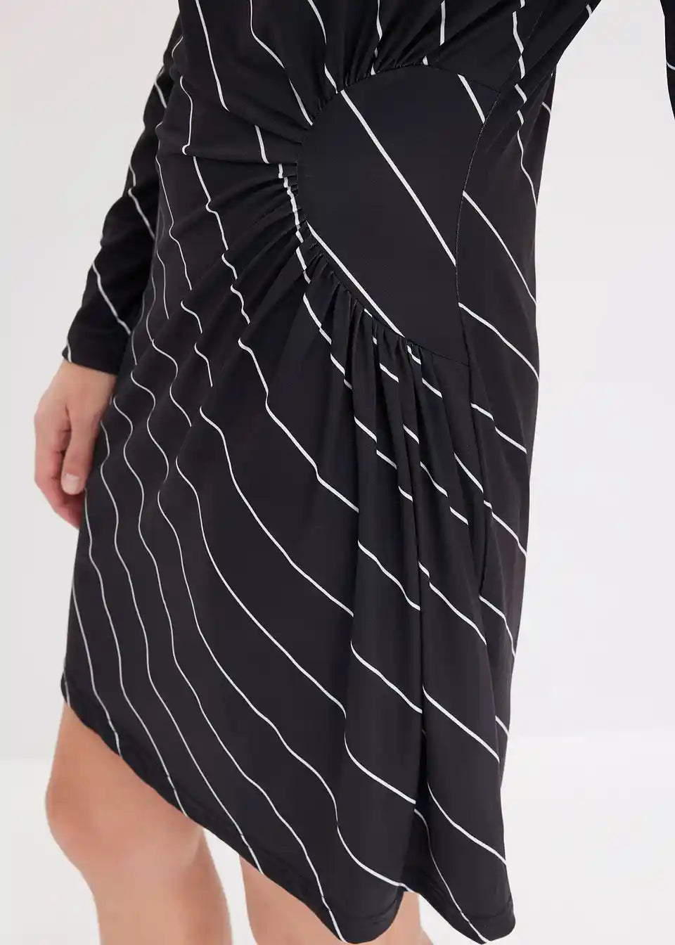 Vpadljiva obleka z asimetričnim robom in rokavi na zvonec