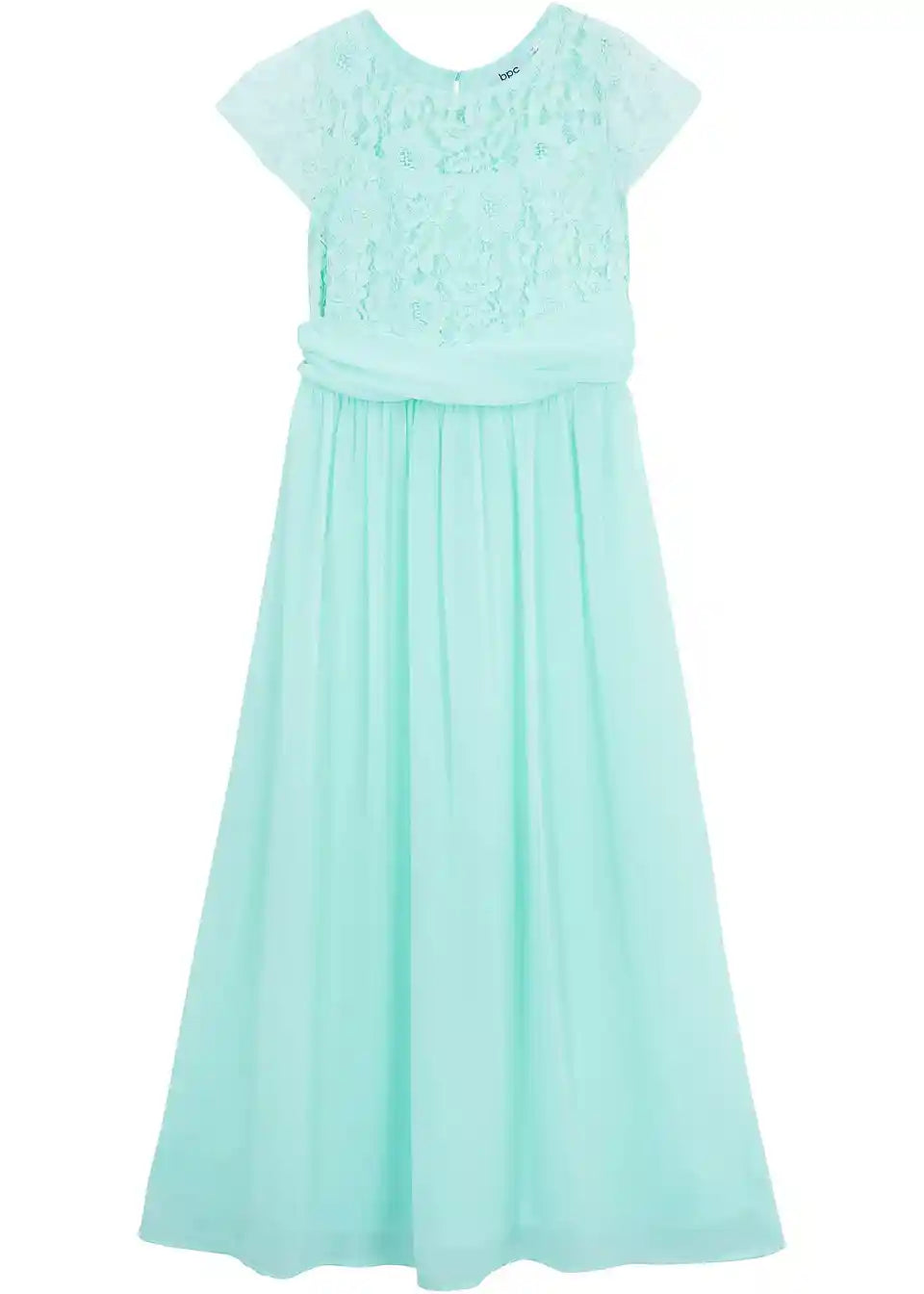Praznična obleka s čipkastim zgornjim delom za poseben nastop. Tekoča tkanina na krilu naredi obleko pravi vrhunec.