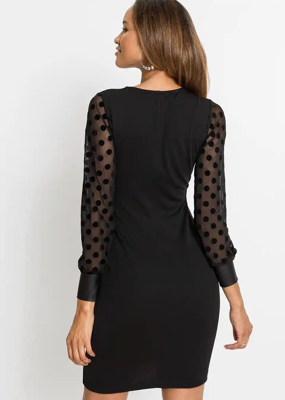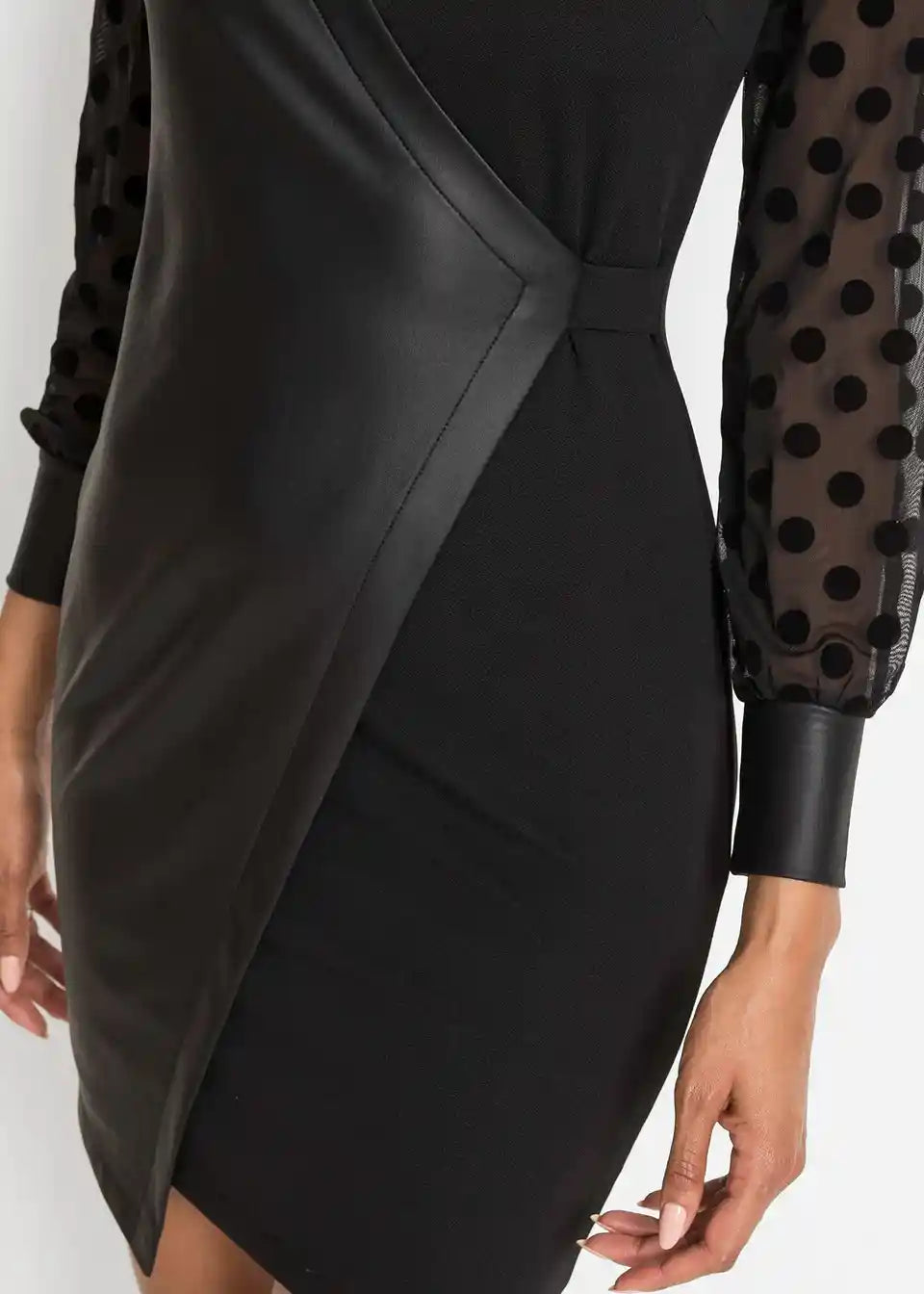 Obleka iz umetnega usnja z všitkom iz jerseyja in pikastimi mrežastimi rokavi