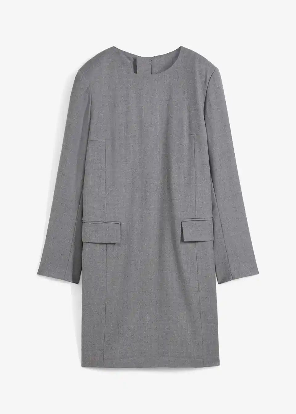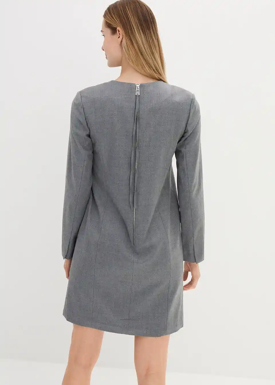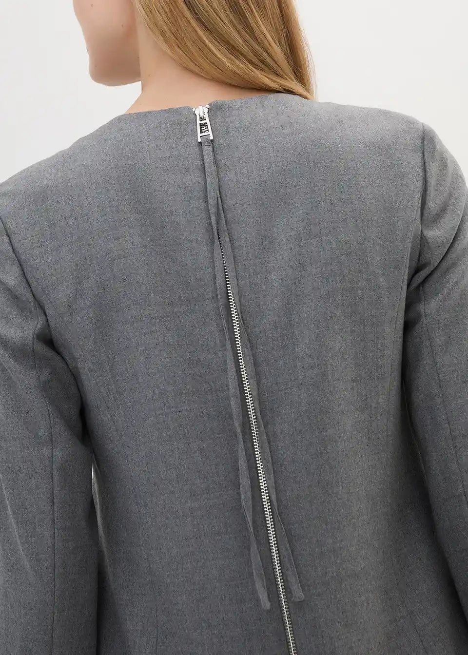 moderna volnena obleka z zadrgo na hrbtni strani, ramenskimi blazinicami in stranskimi žepi s preklopom