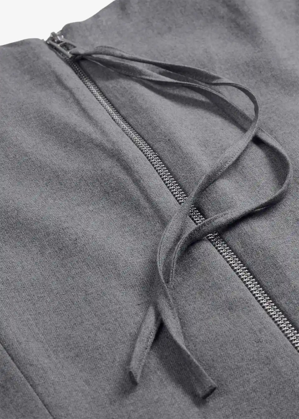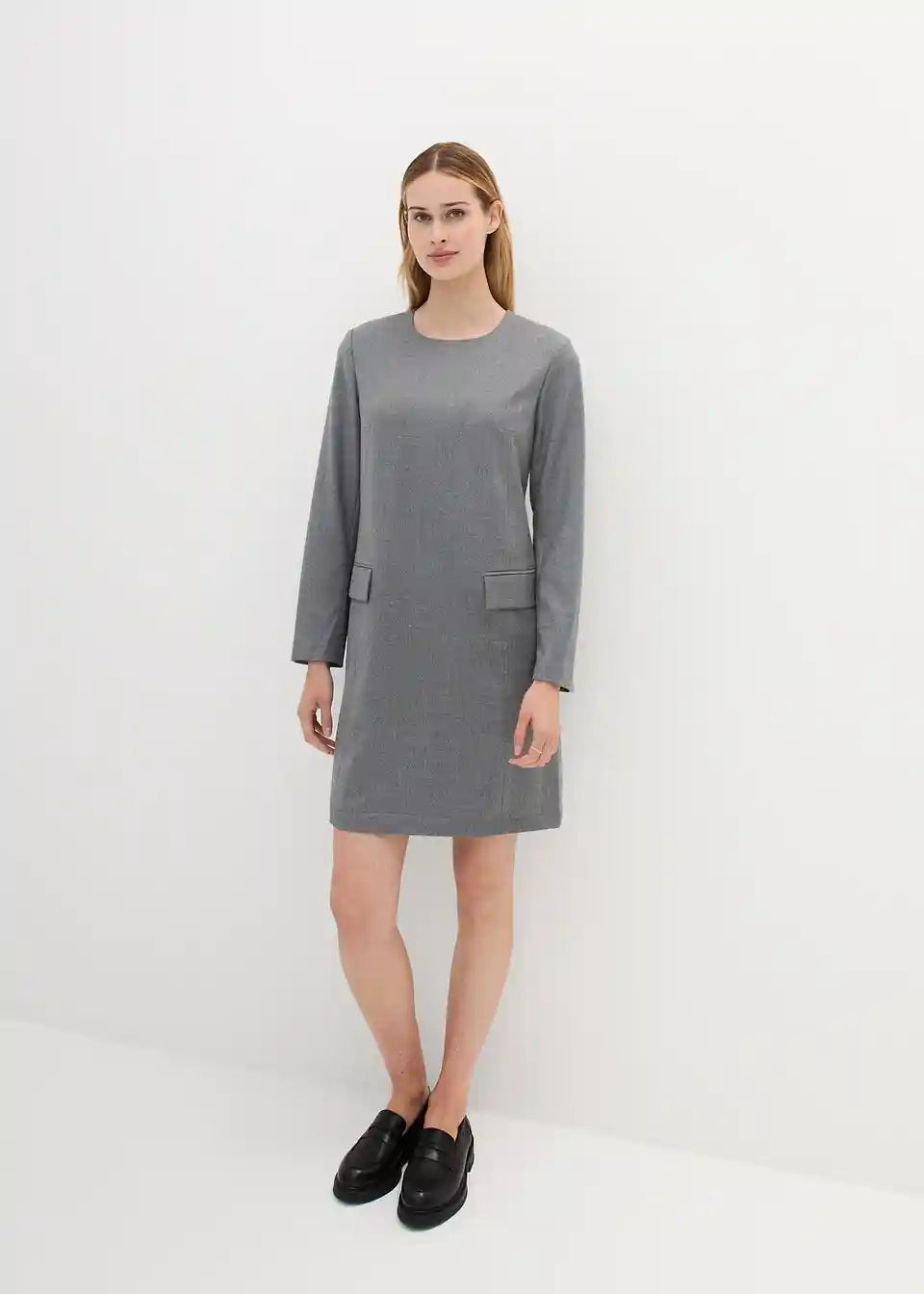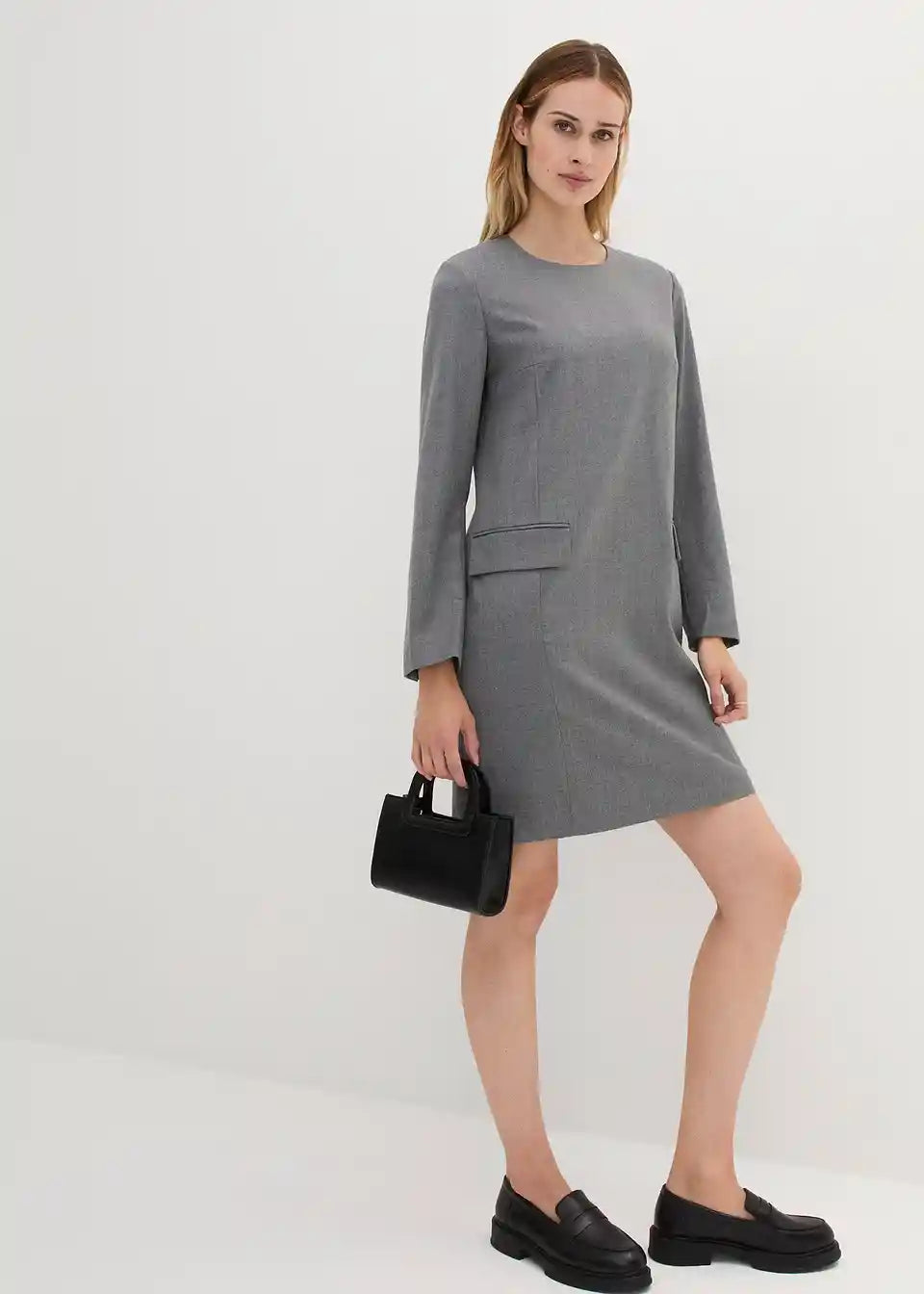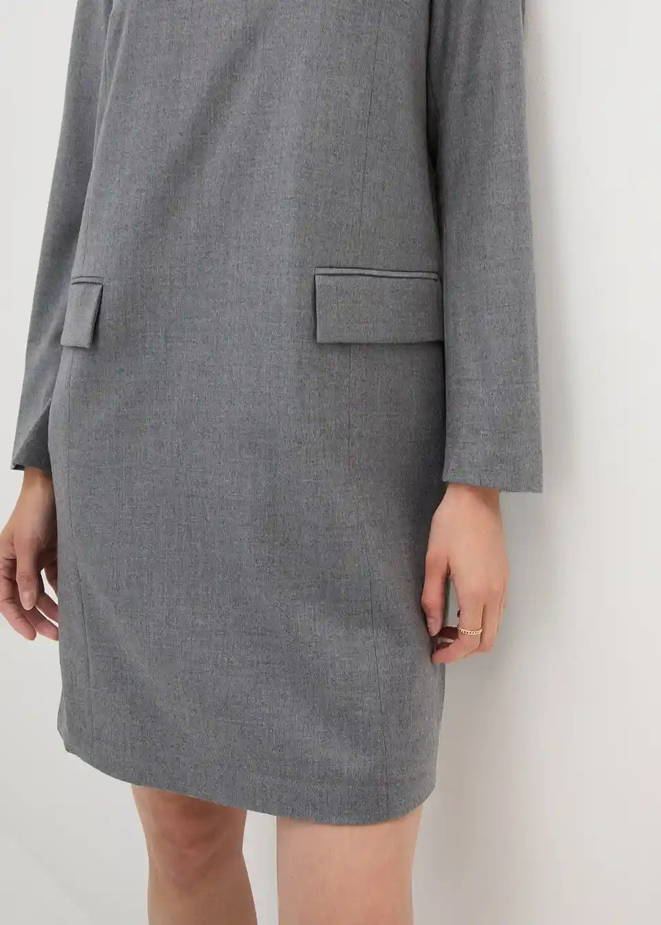 moderna volnena obleka z zadrgo na hrbtni strani, ramenskimi blazinicami in stranskimi žepi s preklopom