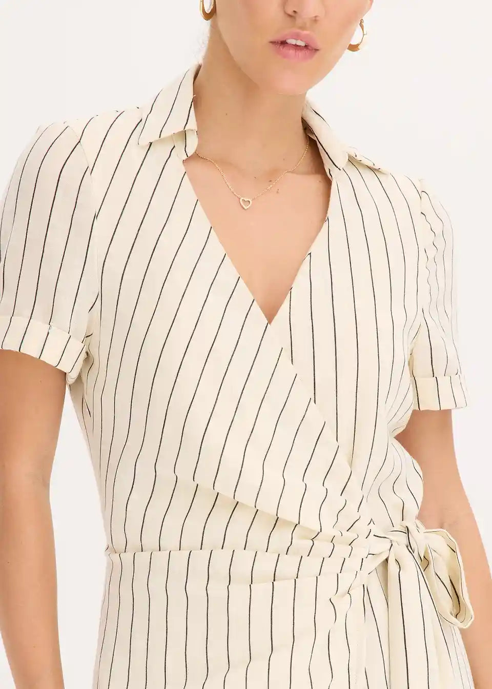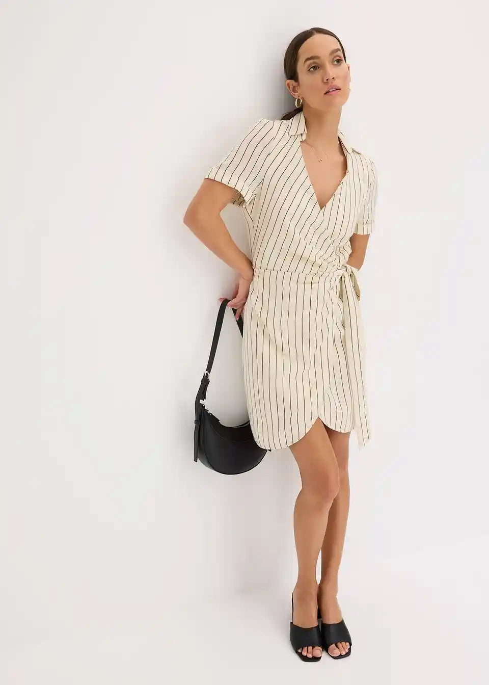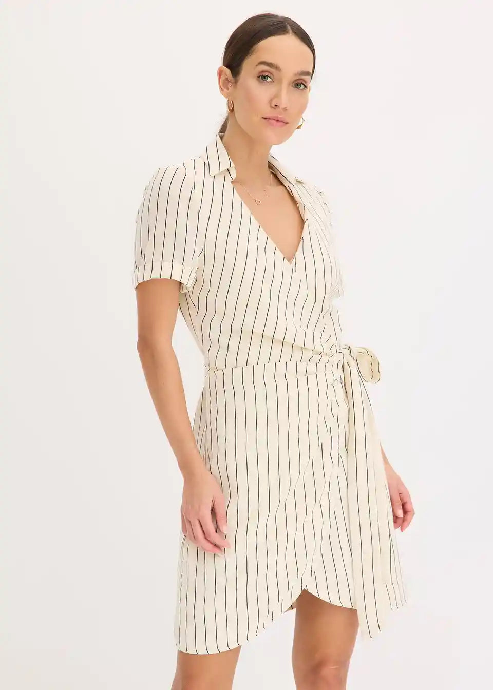 modna obleka na preklop z videzom lana in zavezovanjem ob strani