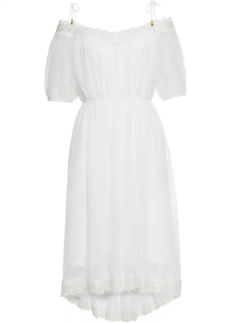 Ta zapeljiva obleka z odkritimi rameni in čipko združuje več aktualnih trendov v svojem očarljivem dizajnu: čudovita midi obleka znamke BODYFLIRT očara z atraktivnim Carmen izrezom in prefinjenim robom Vokuhila. Za dober oprijem poskrbijo subtilen šiv v pasu in tanke špageti naramnice. Na dekolteju in spodnjem robu je ta vpadljiv model okrašen z nežno čipko.