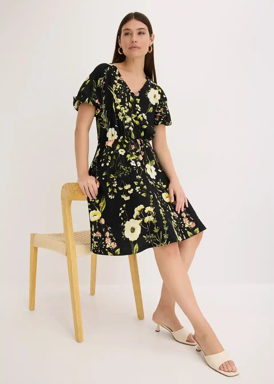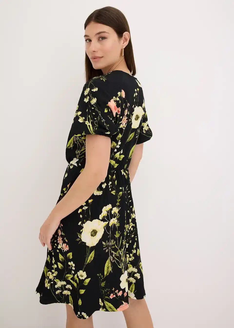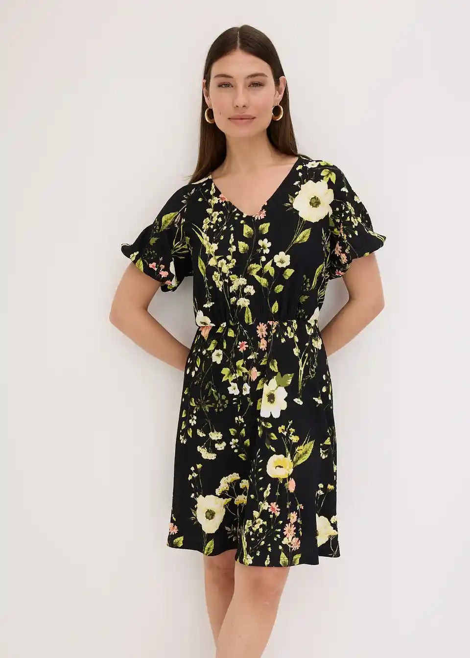 kratka obleka iz strukturiranega jerseya z rožastim potiskom