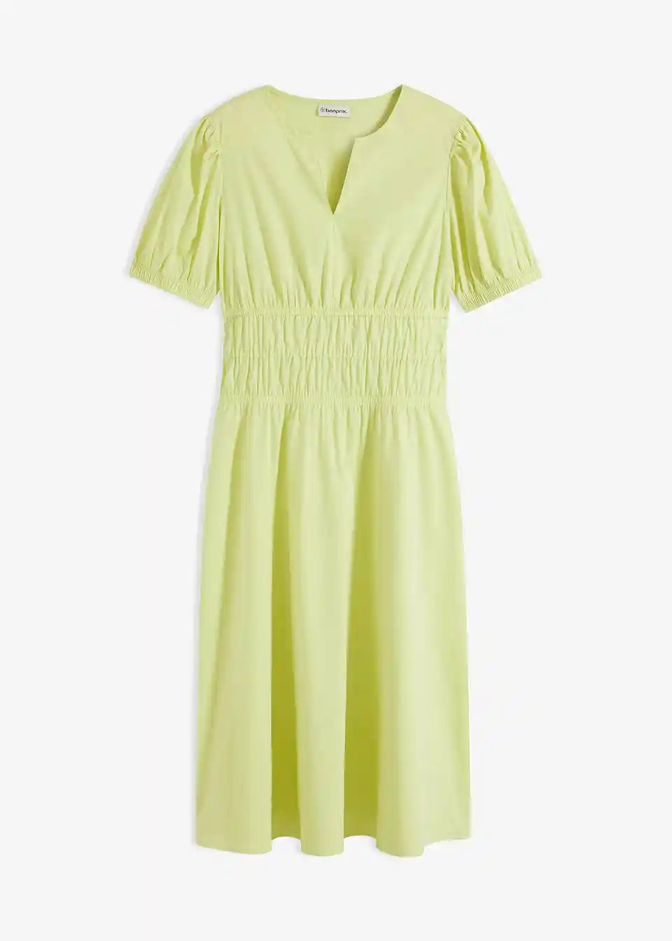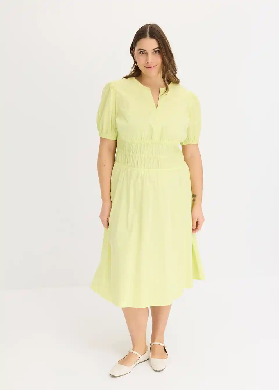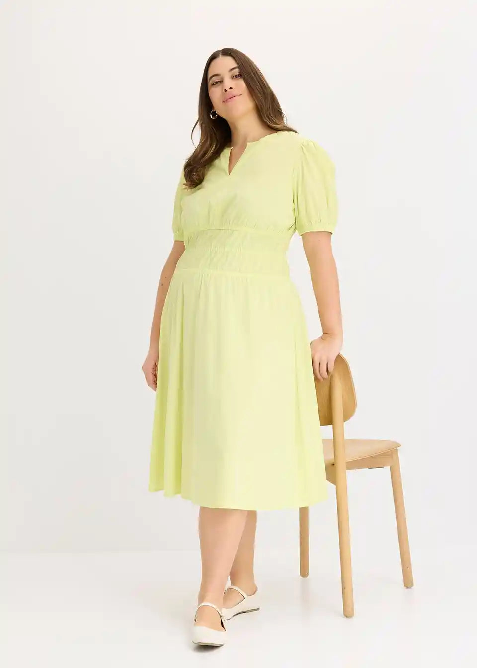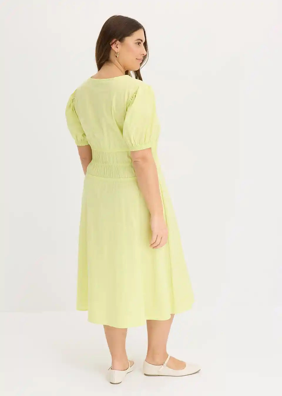 Široko krojena obleka s 3/4 napihnjenimi rokavi in nabiranjem v pasu