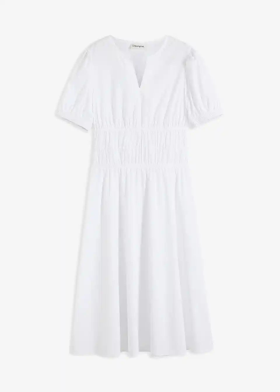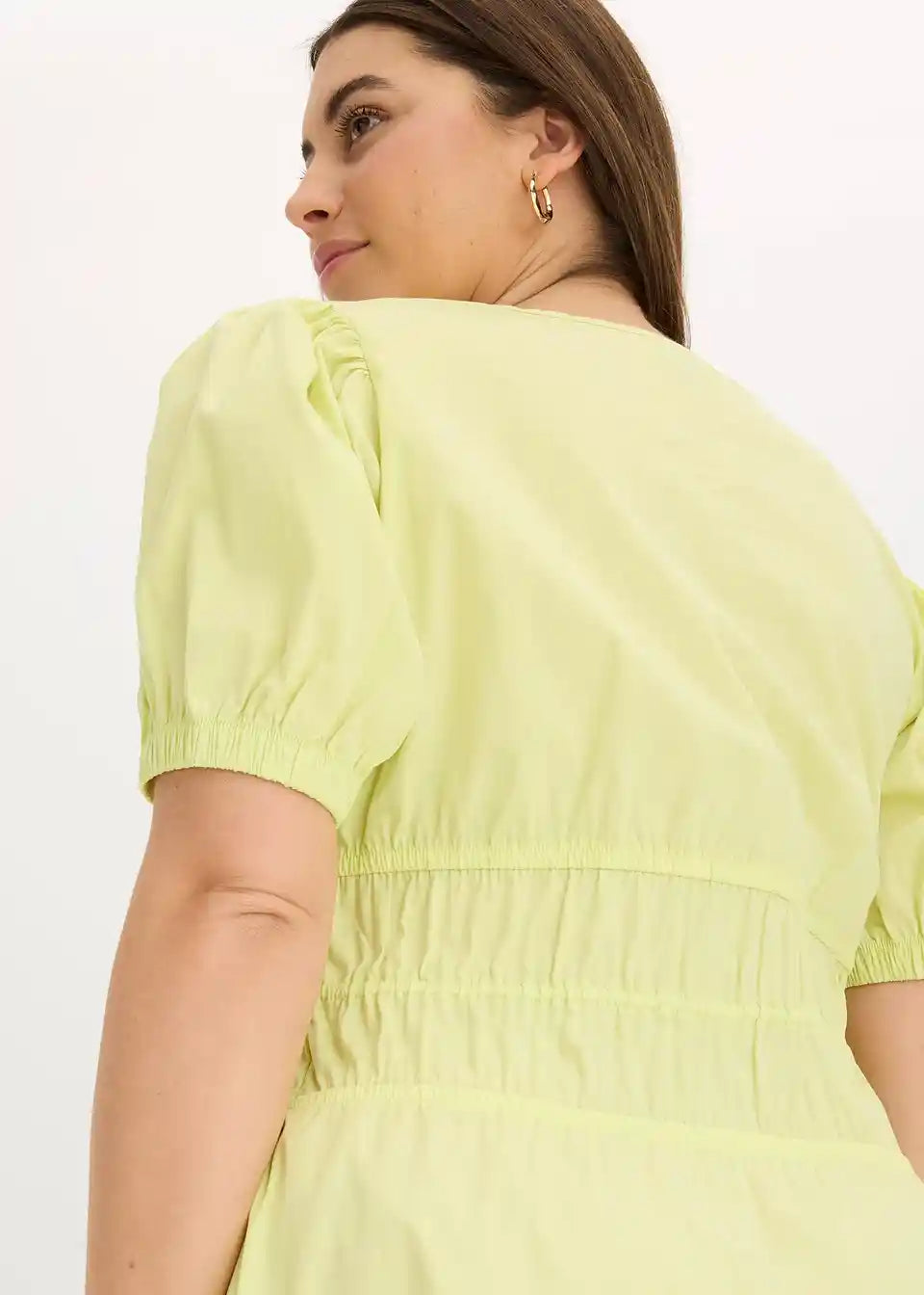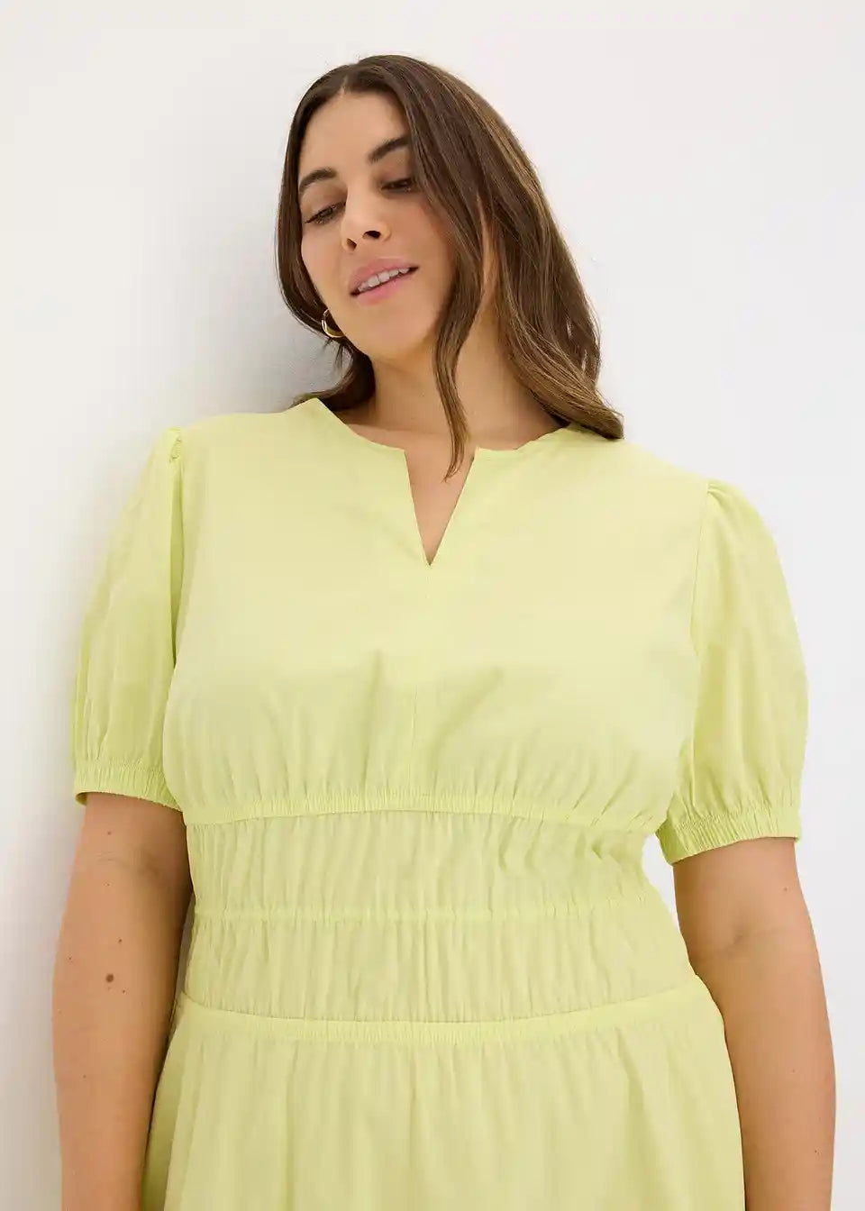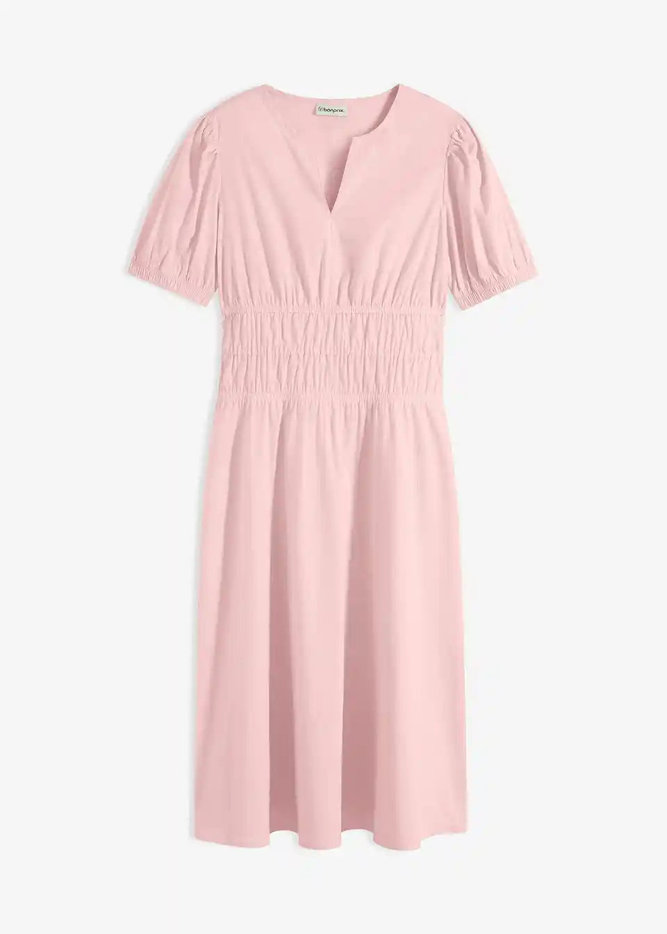 Široko krojena obleka s 3/4 napihnjenimi rokavi in nabiranjem v pasu
