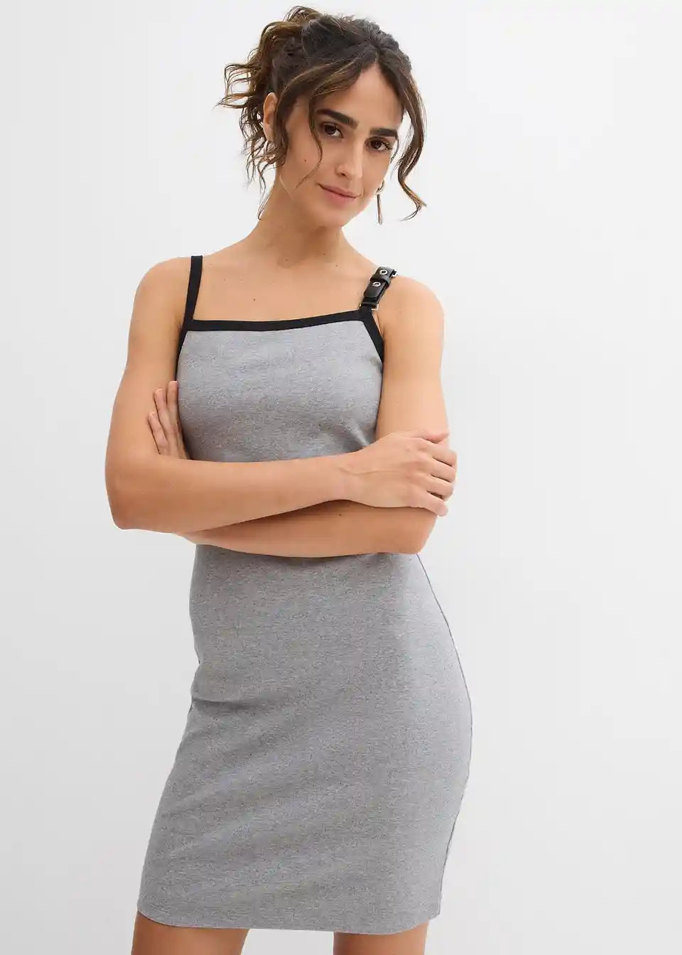 Modna obleka z naramnicami in kontrastnim robom iz rebrastega materiala