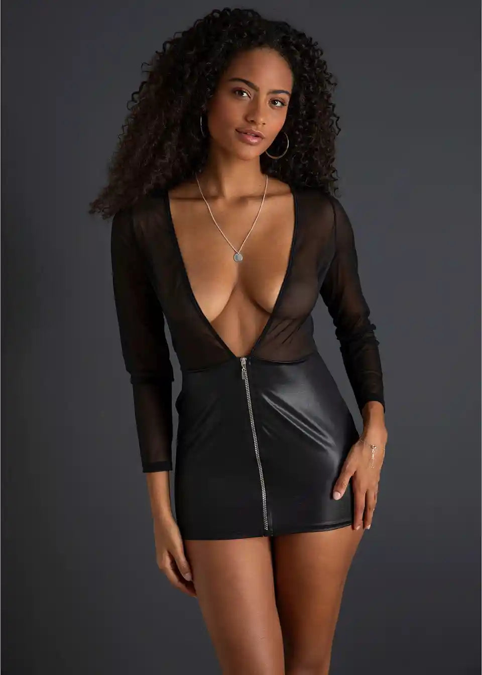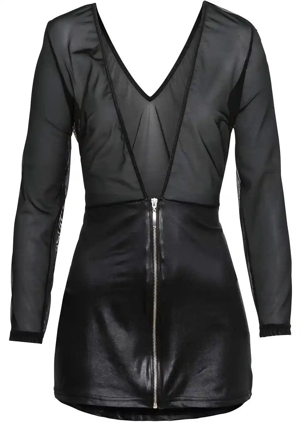 Čista erotika! Ta seksi obleka ima toliko komponent, ki vas bodo očarale. Prozoren material na zgornjem delu zapeljivo razkriva vaše obline. Globok izrez popolno poudari vaš dekolte. Kratek, oprijet krilni del iz elastičnega materiala z Wet-Look videzom se popolnoma prilagodi vašemu telesu in se lahko enostavno odpre z zadrgo na sredini sprednjega dela. Te komponente tvorijo seksi obleko za erotičen večer. Obleko dopolnite s črnimi ali rdečimi visokimi petami.