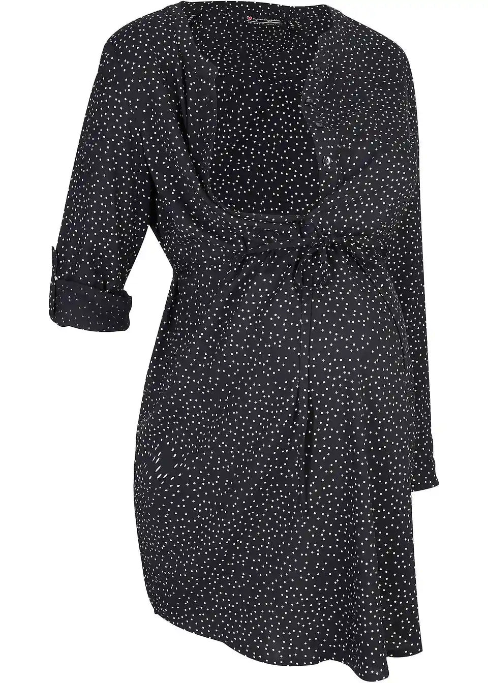 Dolga bluza iz tekoče viskoze, ki objame postavo. Lahko se nosi kot obleka ali bluza. Odstranljiv pas poudari rastoči nosečniški trebuh. Dolžina rokavov je nastavljiva s trakovi in gumbi. Po nosečnosti omogoča preprosto dojenje zahvaljujoč gumbom na sprednji strani.