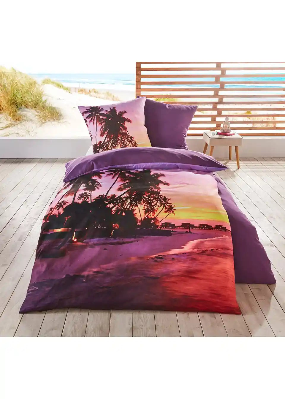 Obojestranska posteljnina s plažo, sončnim zahodom, morjem in palmami