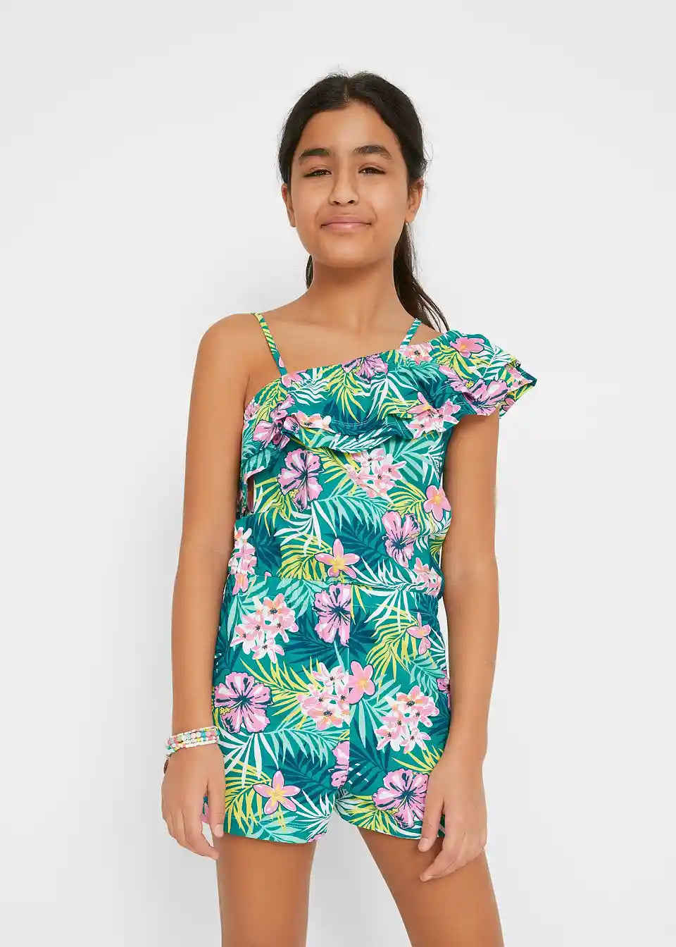 Čudovit Jumpsuit za dekleta s trendovskim cvetličnim potiskom. Nastavljive naramnice za optimalno prileganje. Igriv volan na izrezu. Udoben elastičen pas.