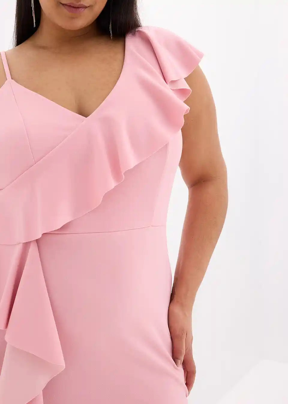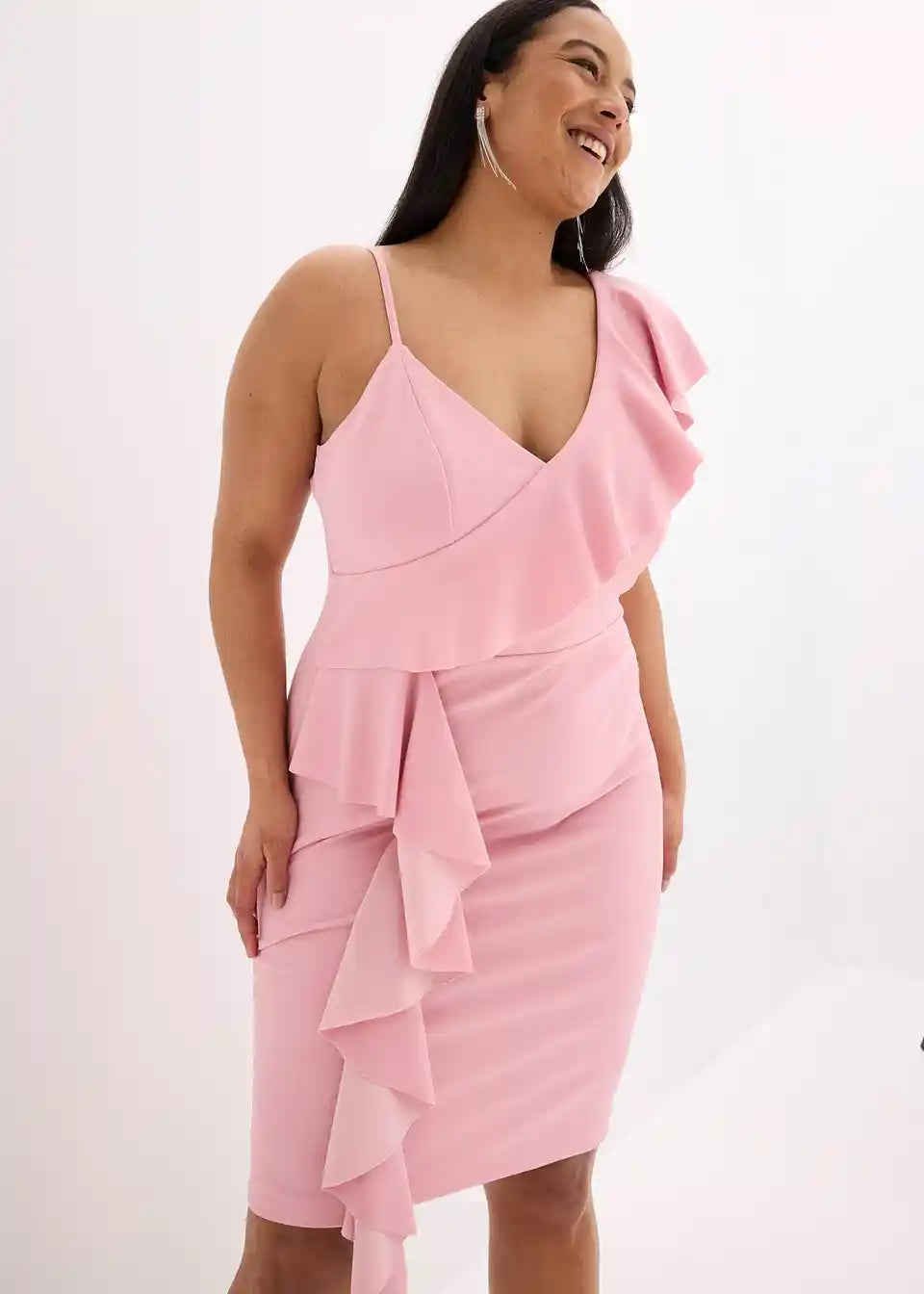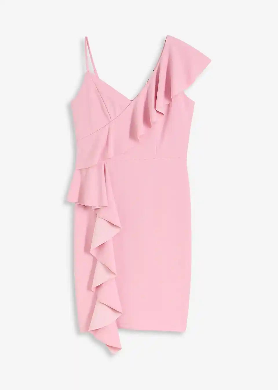 Moderna in ženstvena: oprijeta Bodycon obleka mini dolžine s spaghetti naramnicami in volančki.