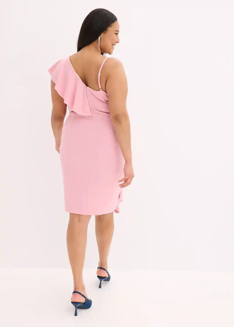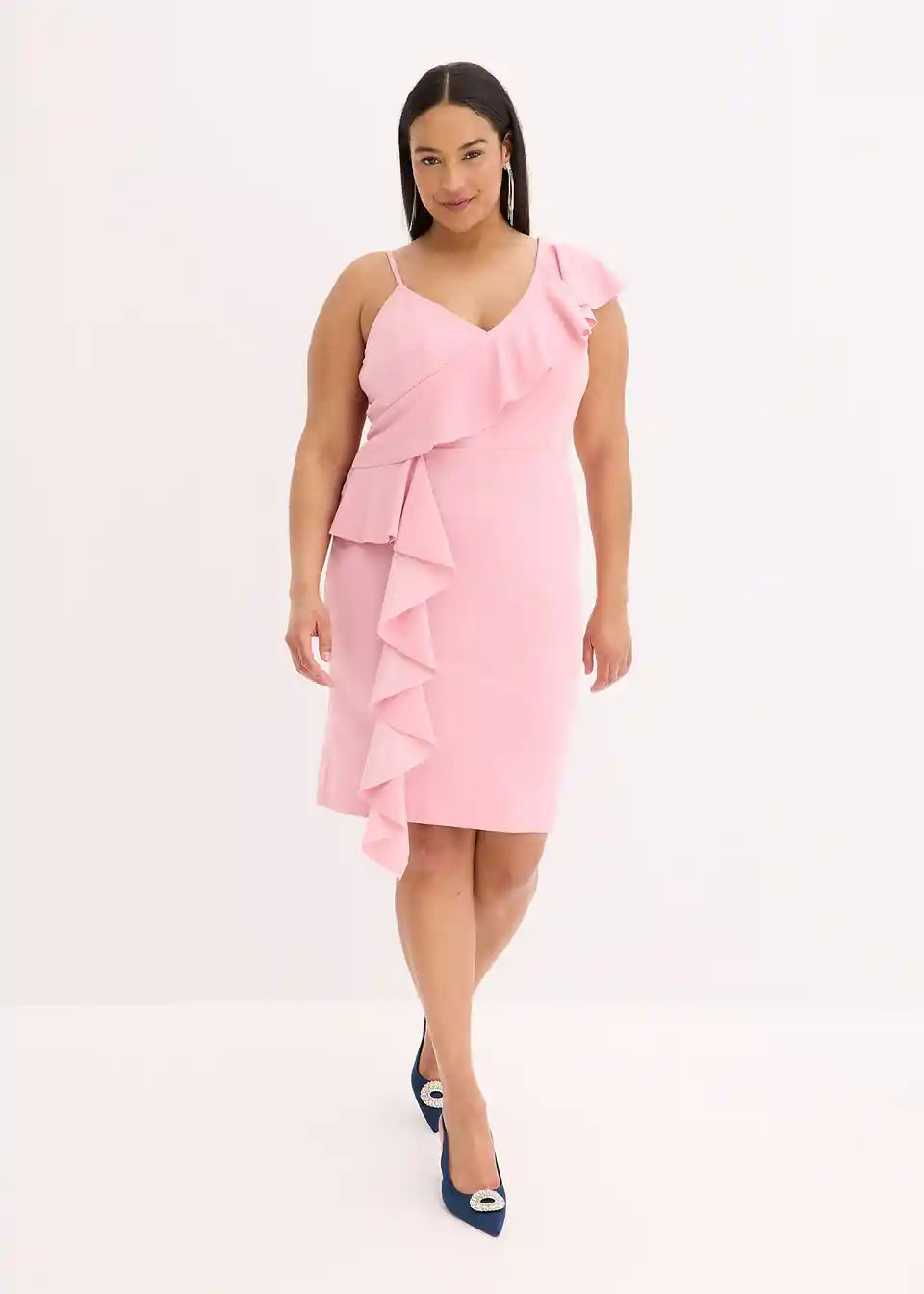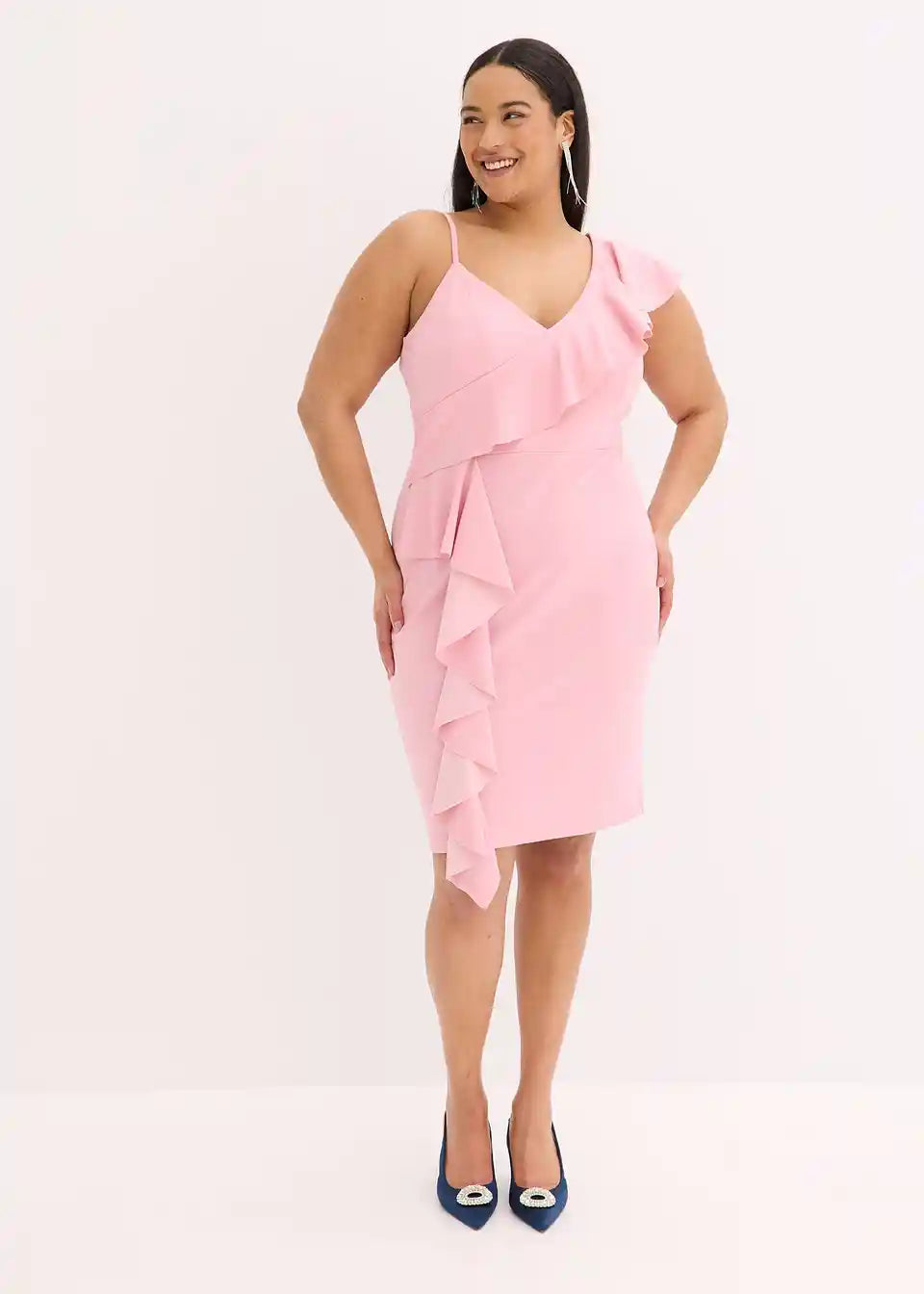 Moderna in ženstvena: oprijeta Bodycon obleka mini dolžine s spaghetti naramnicami in volančki.