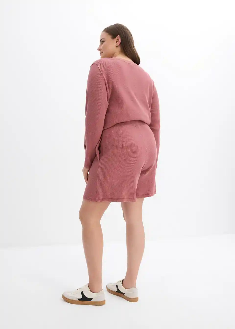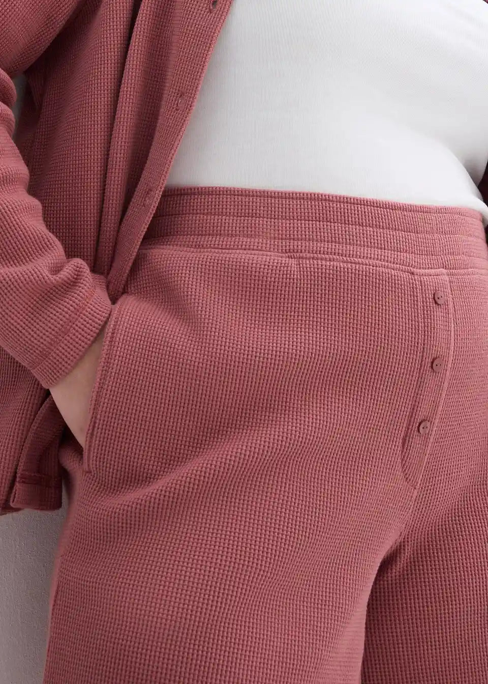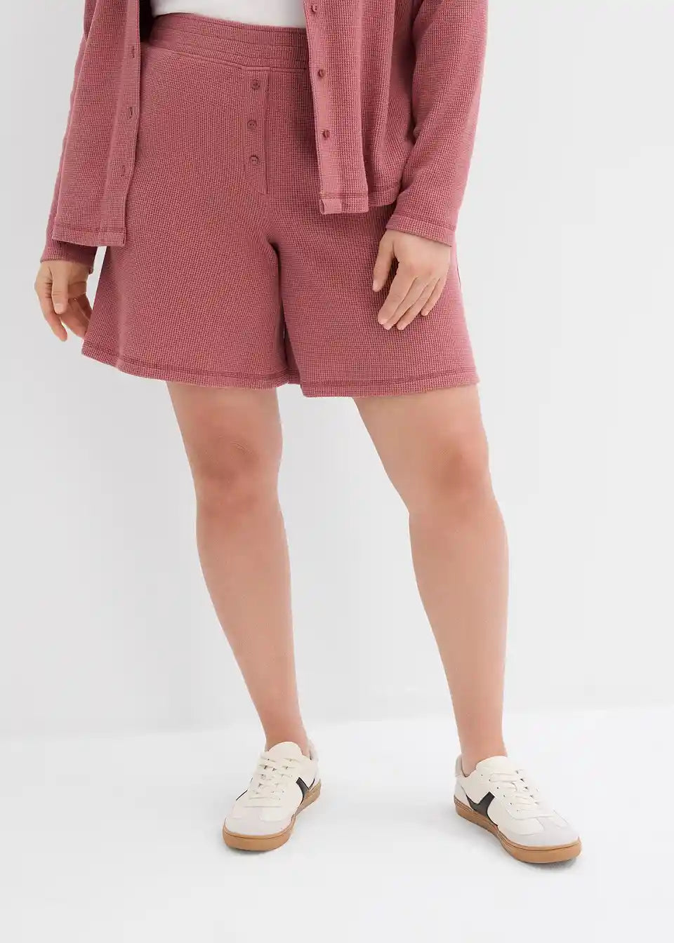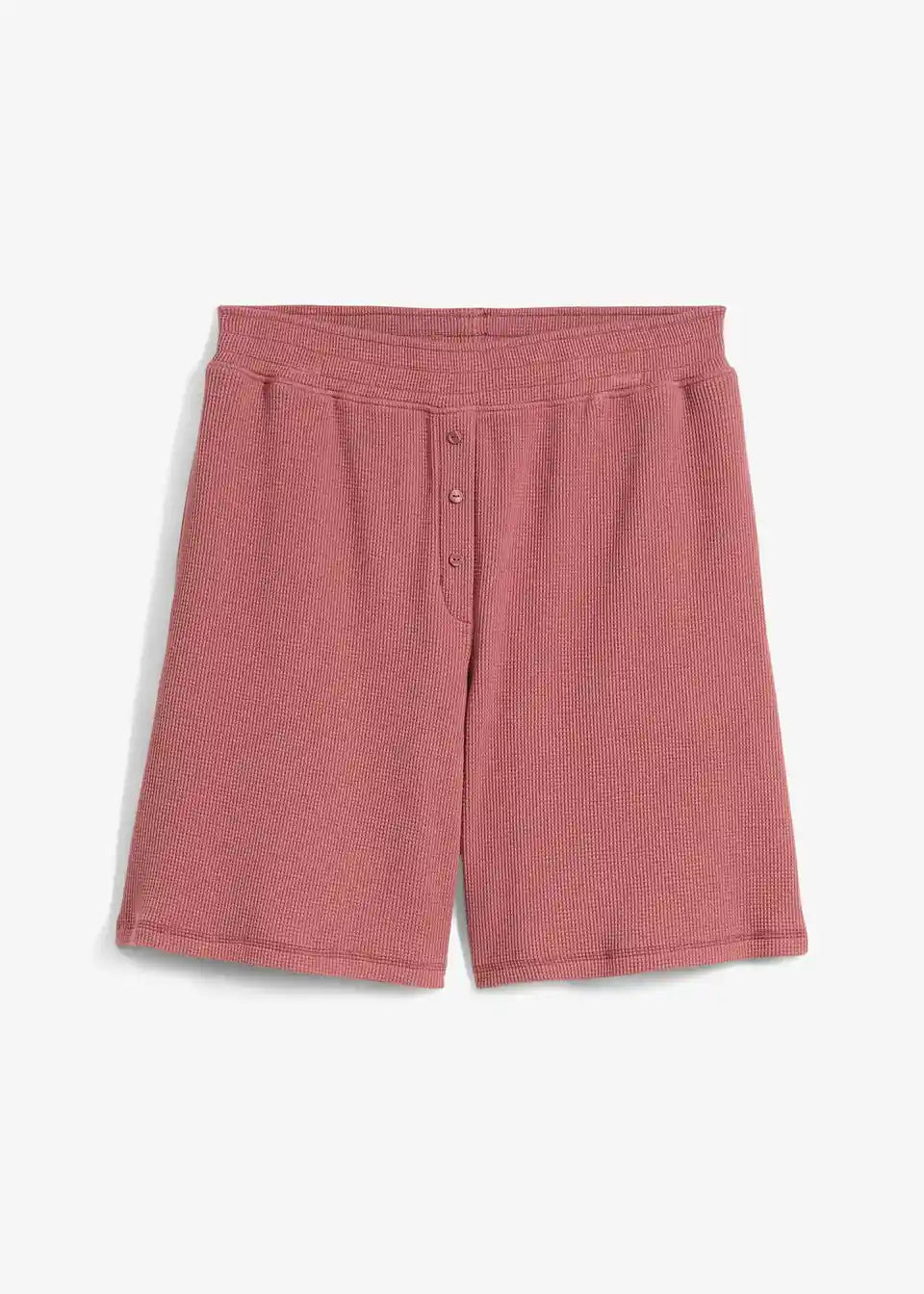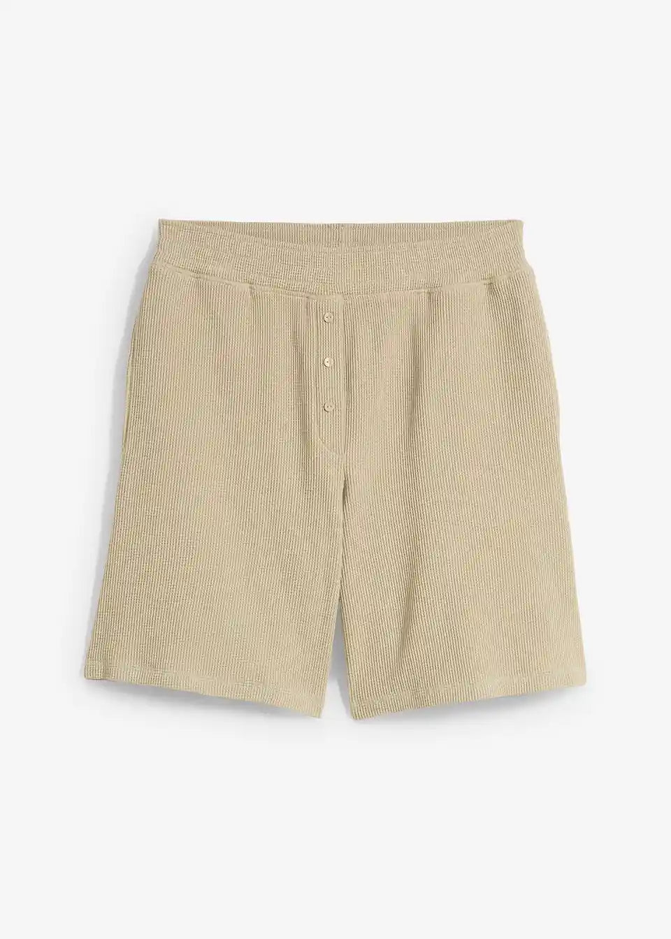 Kratke hlače iz strukturiranega waffle jerseya. Oprijeti stil z elastičnim pasom in okrasnimi gumbi.