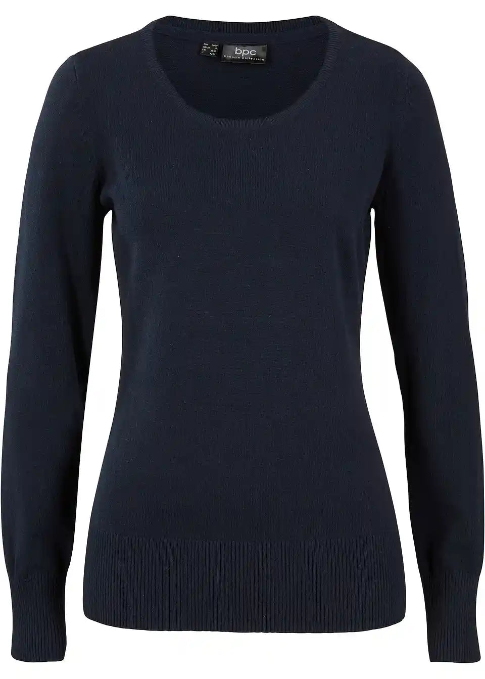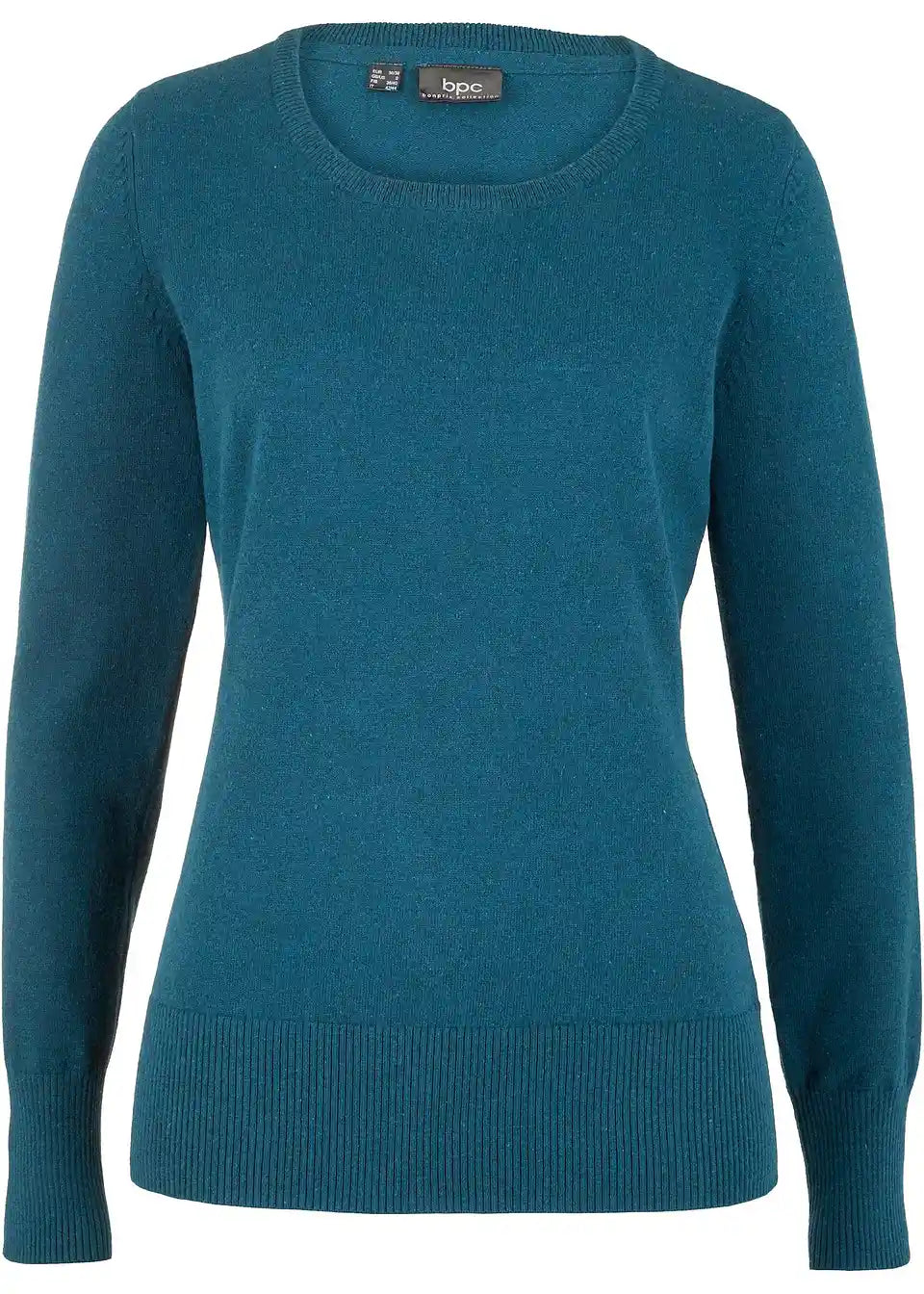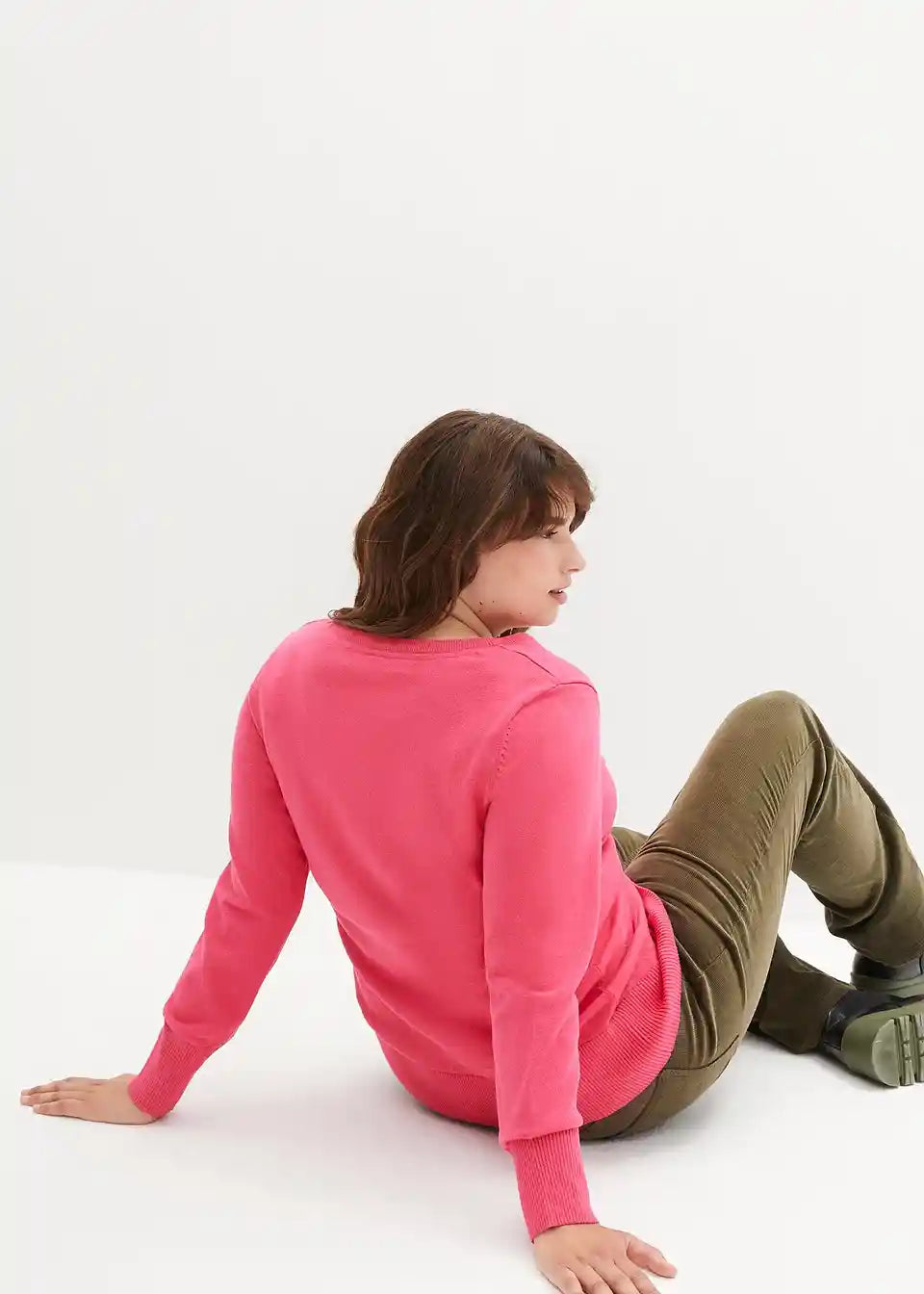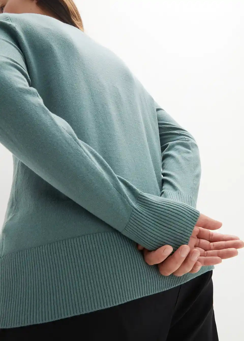 Pulover b.p.c Casual iz finega pletiva, z V-izrezom in rebričastimi robovi. Dolžina približno 64 cm (velikost 36/38) do približno 72 cm (velikost 52/54), pralno v stroju
