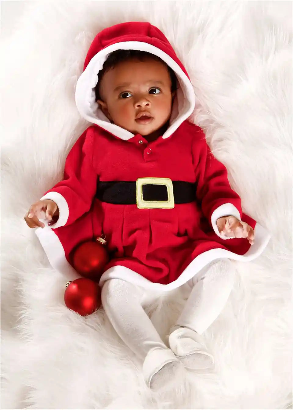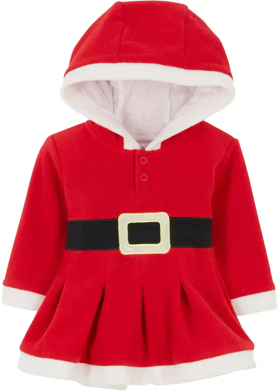 Božična oblačila za deklice, ki že nestrpno pričakujejo božični čas. Ta mehka oblekica v stilu Božička je pravi privlačen detajl! Praktična kapuca in mehki material zagotavljata dodatno udobje.