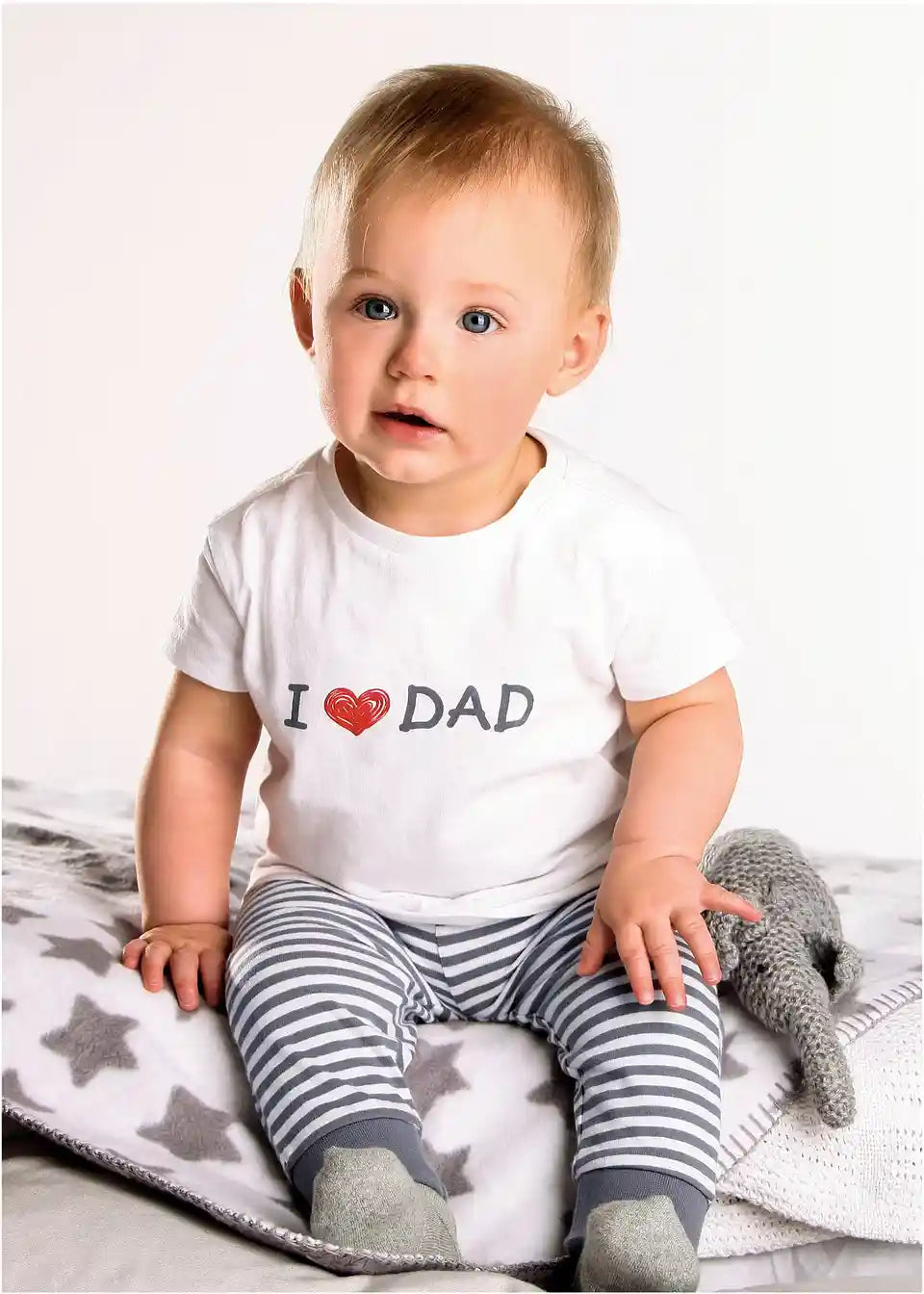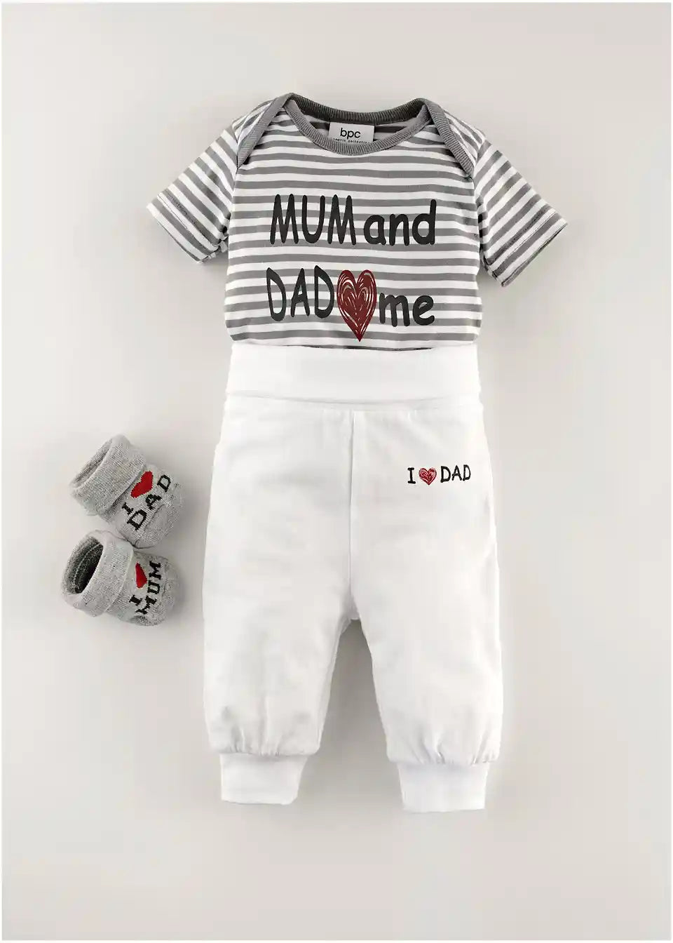 Praktični dvodelni komplet vsebuje en primerek z vzorcem črt in napisom "I love MUM" ter enobarvni primerek z napisom "I love DAD". Hlače so udobno krojene, z manšetami na zaključku hlačnic in širokim prepogibnim pasom. Tako nič ne tišči in dojenček se lahko svobodno premika.