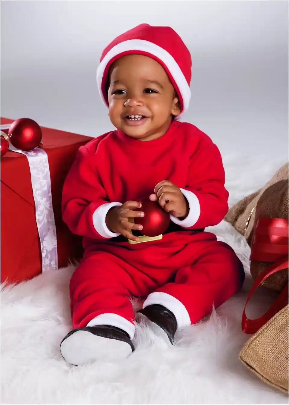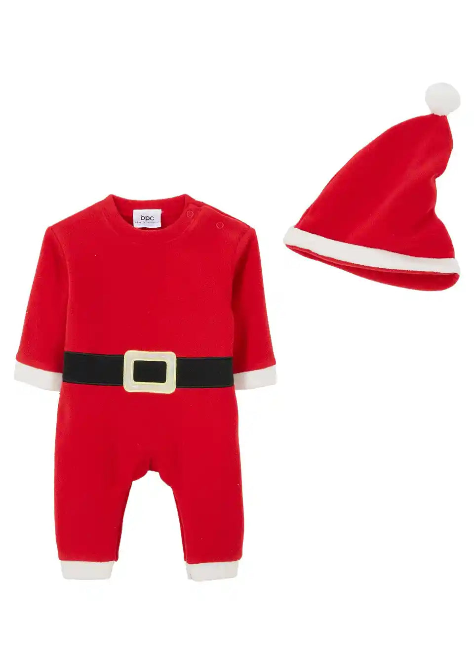 Popolna praznična oprava za božični čas je ta ljubek otroški pajac za dečke s pripadajočo kapico. Posebej praktičen je pajac zaradi svojega vsakdanje uporabnega kroja. Ima klasičen okrogel izrez in se za hitro menjavo pleničke odpre v koraku z gumbi na pritisk.