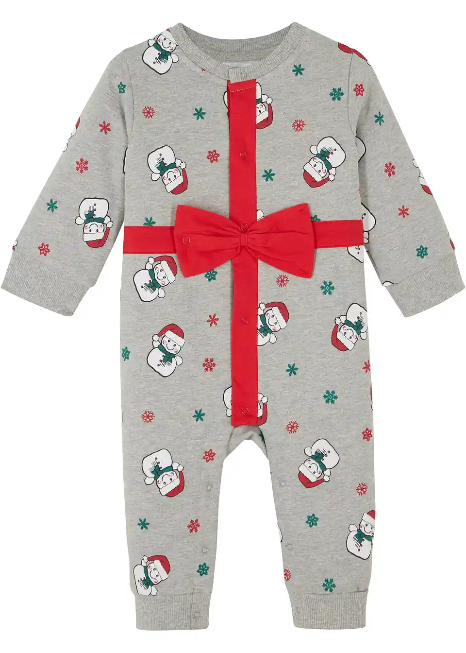 Zelo ljubek pajac z modnim božičnim potiskom in pritrjeno rdečo pentljo. Popoln poudarek za prvo božično praznovanje vašega otroka! Ta pajac je še posebej udoben zaradi širokih, elastičnih robov na nogah in rokavih ter prijetno mehkega materiala iz organskega bombaža.