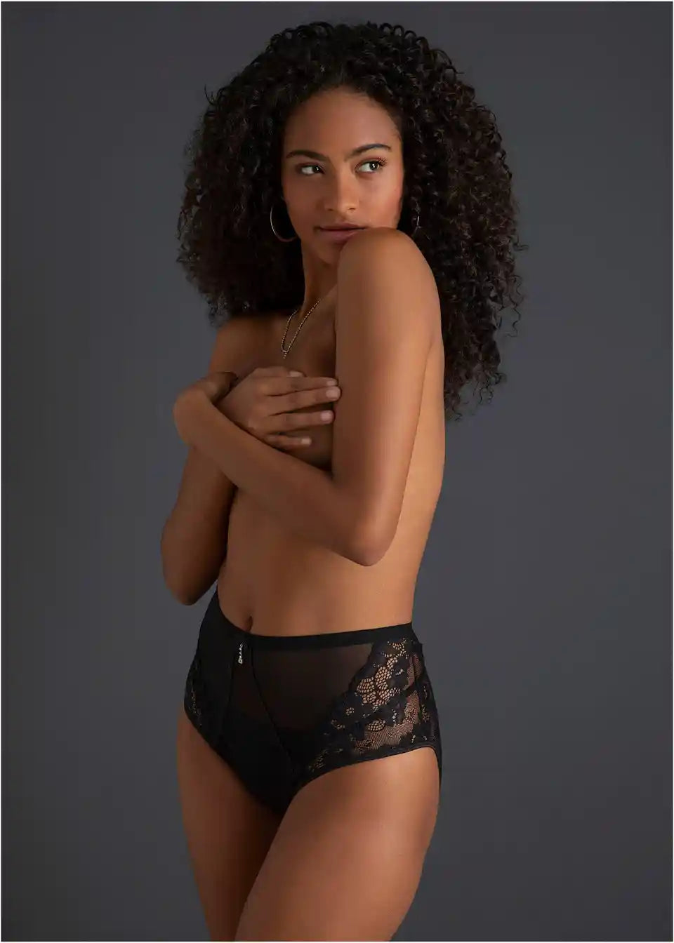 Zapeljite svojega ljubljenega s temi drzno lepimi hlačkami z visokim pasom in odprtim delom. Te lahkotne hlačke segajo do visokega pasu in so ob straneh okrašene z nežno čipko. Posebni poudarki so zapeljivo odprt hrbtni del ter sijoč dodatek na pasu. Hlačke so na voljo tudi v večjih velikostih.