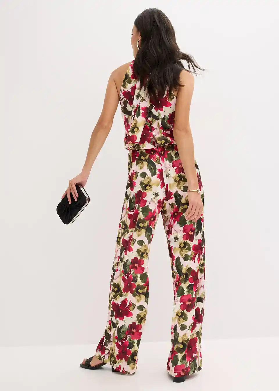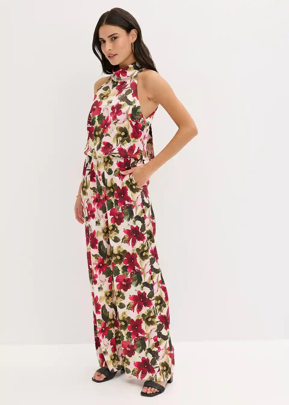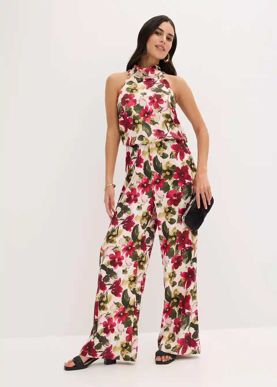Moderen in ženstven: overall iz sijočega satena s cvetličnim potiskom po celotni površini – vsak kos je unikat.