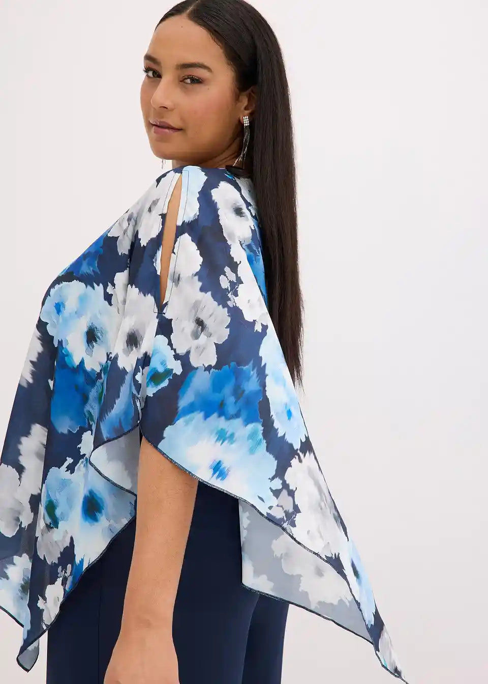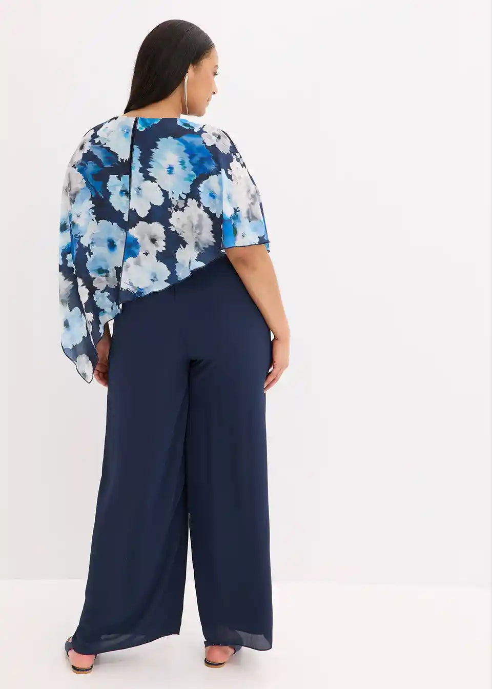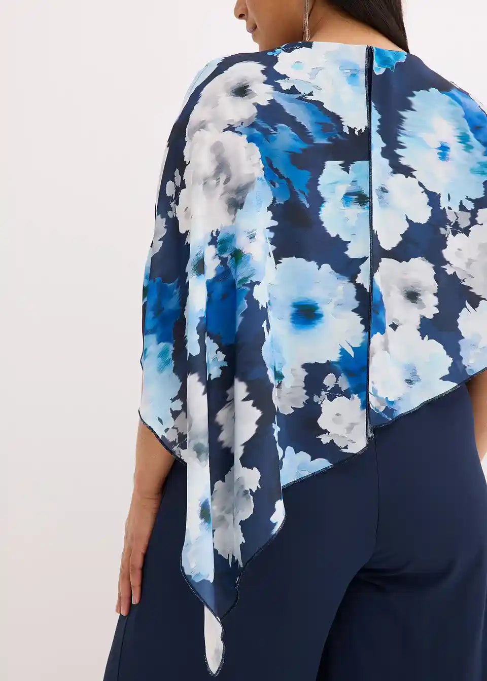 Overall z asimetričnim ogrinjalom iz finega šifona z vzorcem po celotni površini, kar naredi vsak kos unikatnega
