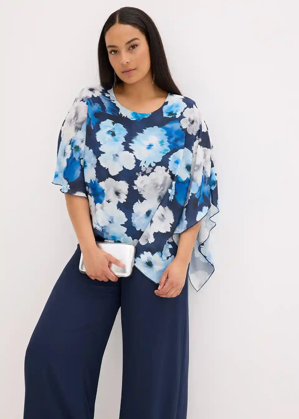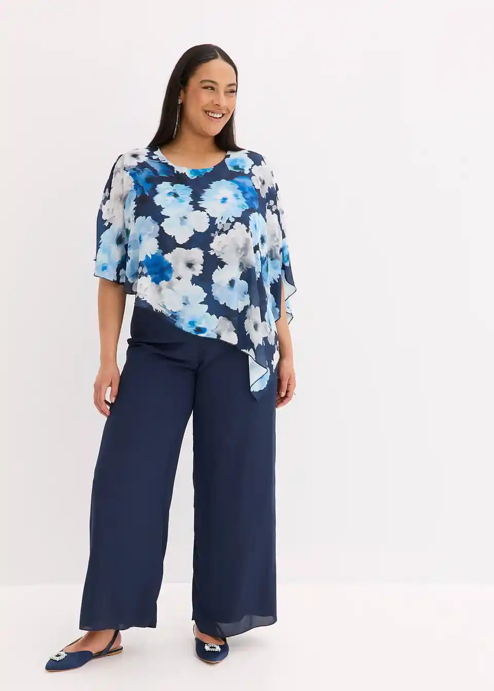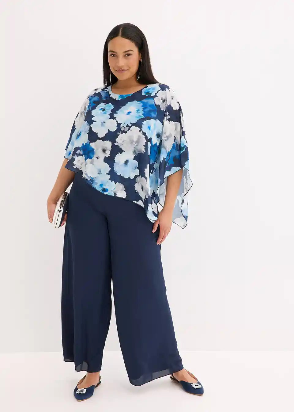 Overall z asimetričnim ogrinjalom iz finega šifona z vzorcem po celotni površini, kar naredi vsak kos unikatnega