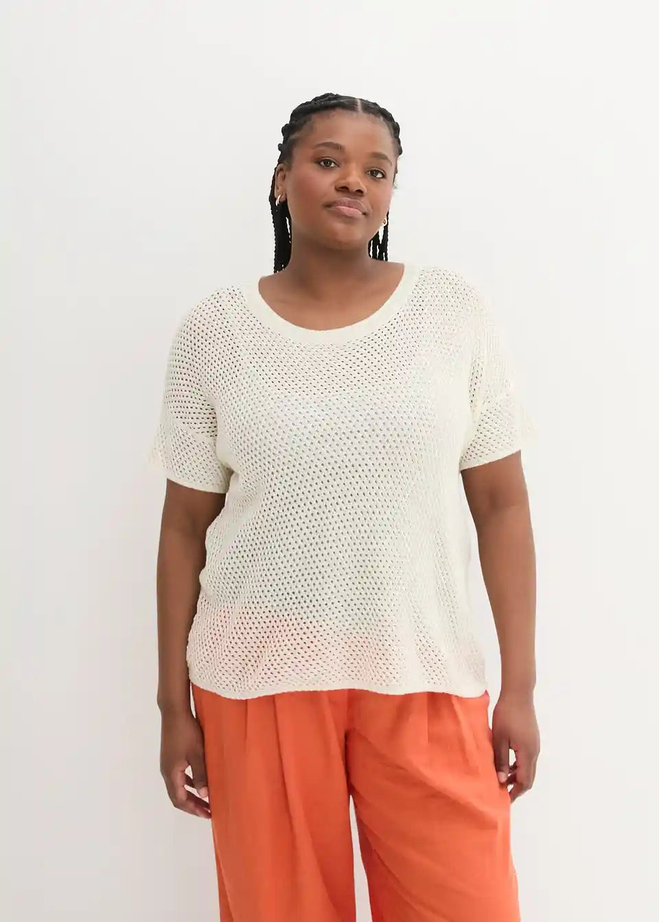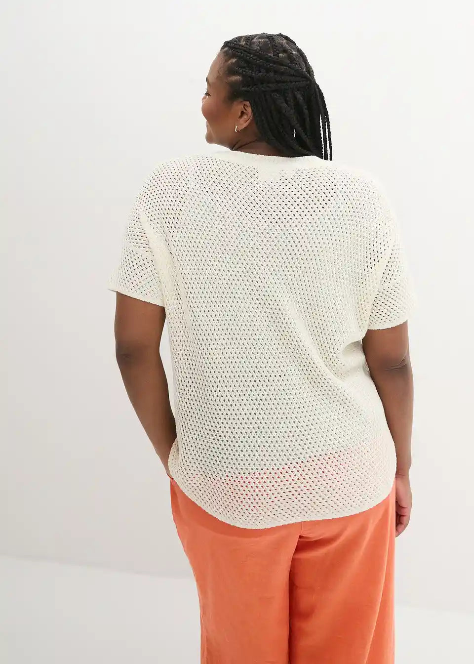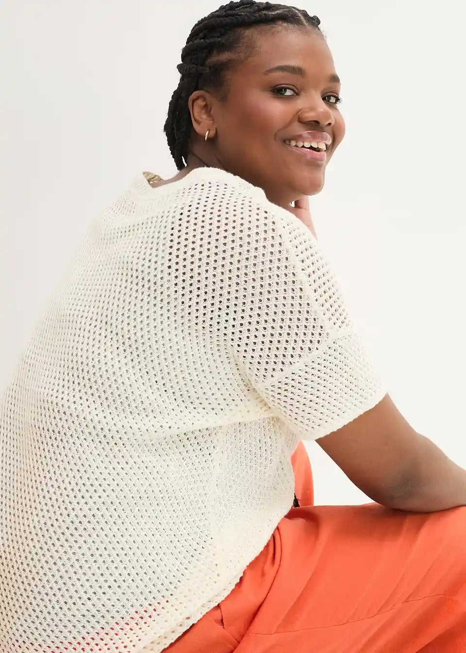 Polovično rokaven ajour pulover prikriva problematične točke s svojim oversized videzom