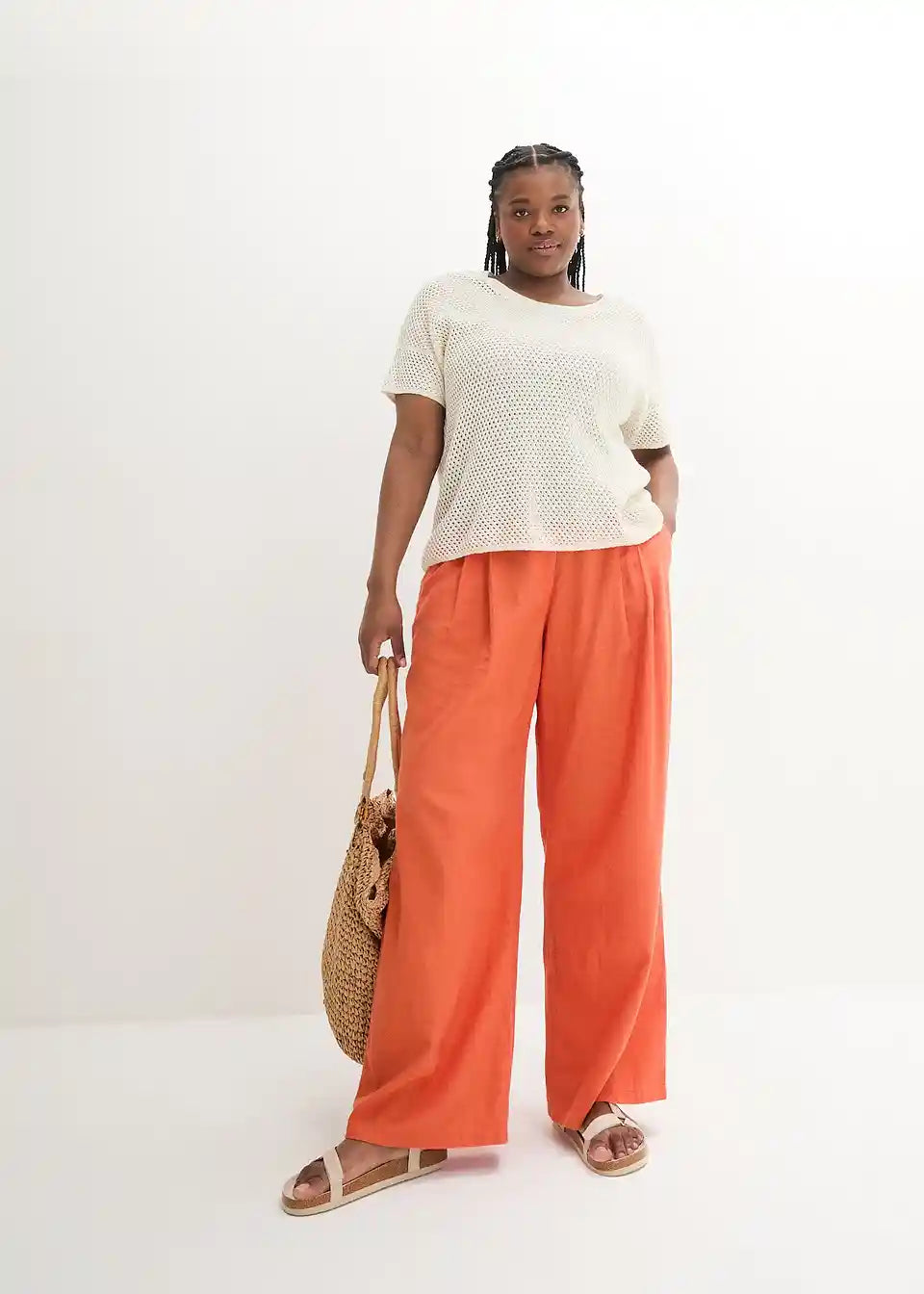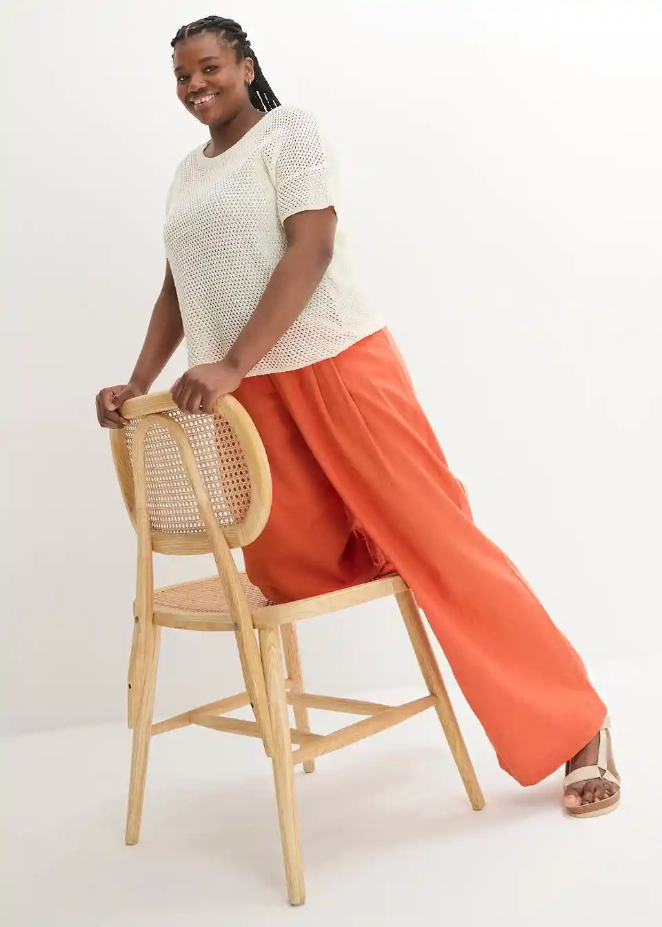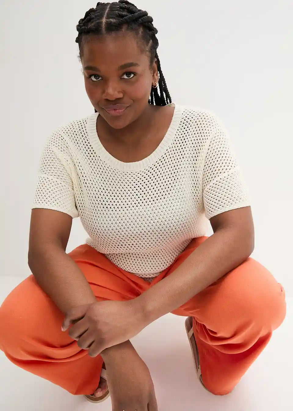 Polovično rokaven ajour pulover prikriva problematične točke s svojim oversized videzom