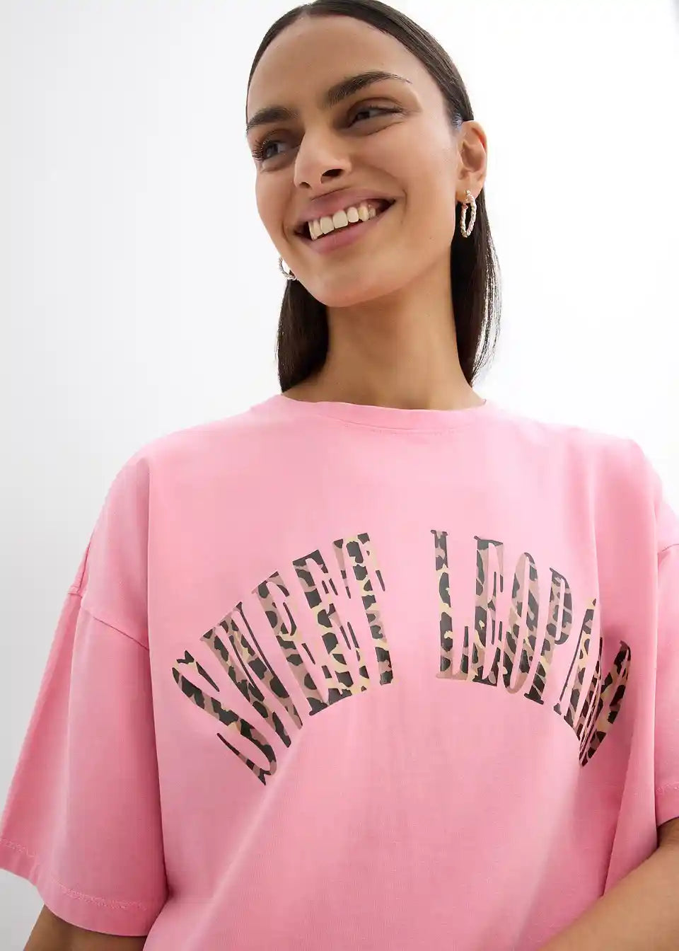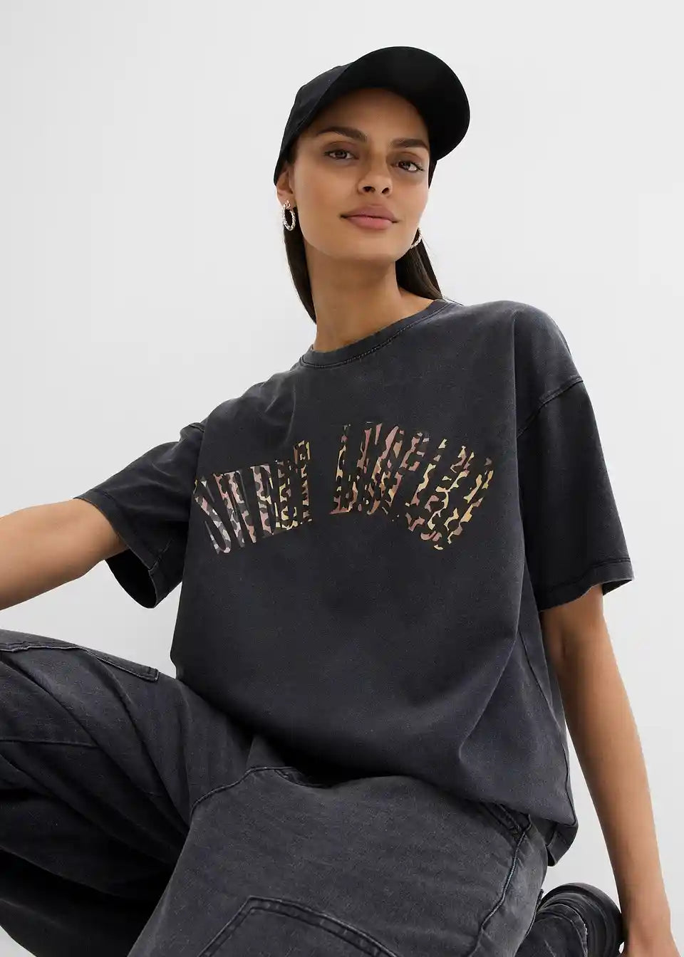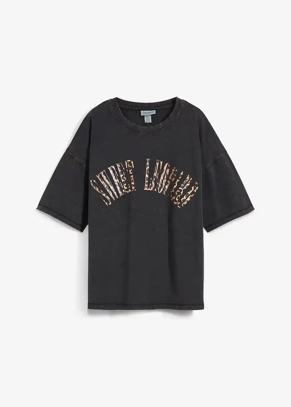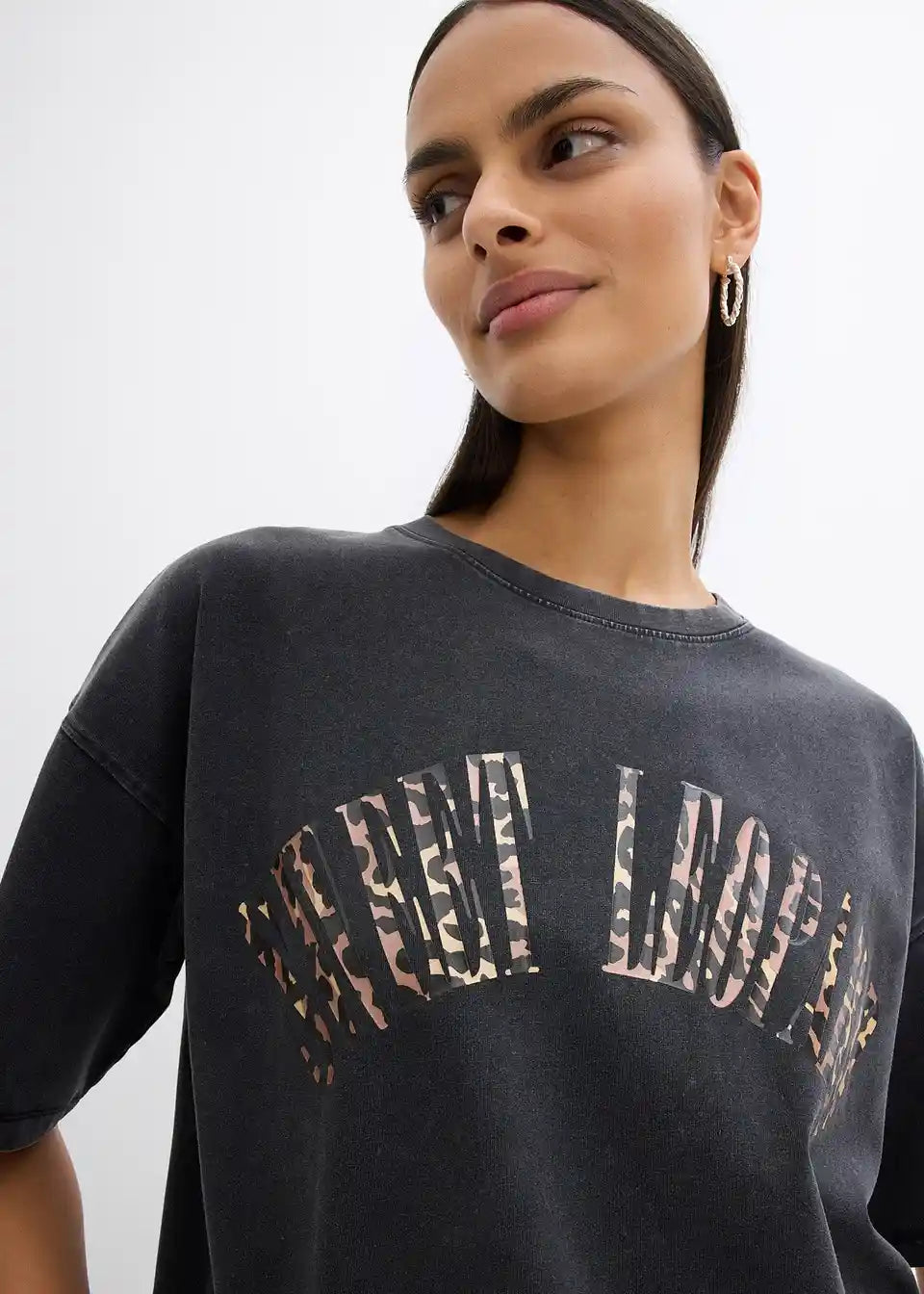 Udobna ohlapna T-Shirt majica z leopardjim napisom z rahlo spranimi predeli
